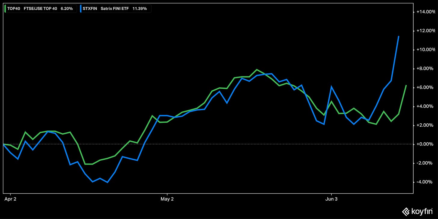 This new coalition is positive for markets and the local currency, as seen by the initial reaction to the news. The South Africa Top 40 Index is up 3.3% this week, while the Satrix Fini Portfolio (a South Africa financial sector ETF) is up over 6%.