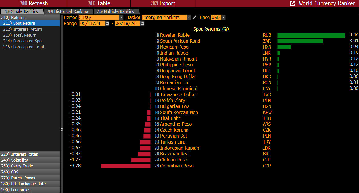 Among emerging-market currencies, the Rand is the second best performer over the last week, behind only the Russian Ruble.