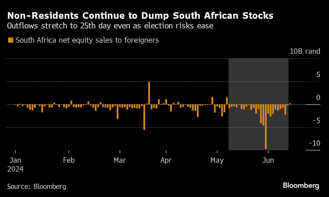 Combine that with non-resident outflows, who sold a net 42.6 billion rand ($2.3 billion) of Johannesburg stocks in the 25-day period before the election, bringing outflows this year to $4.7 billion.