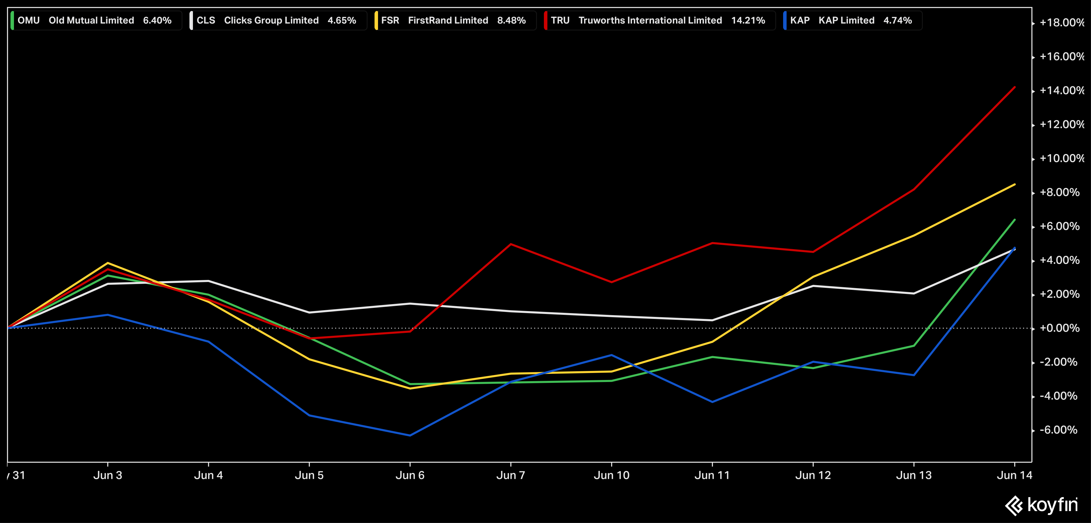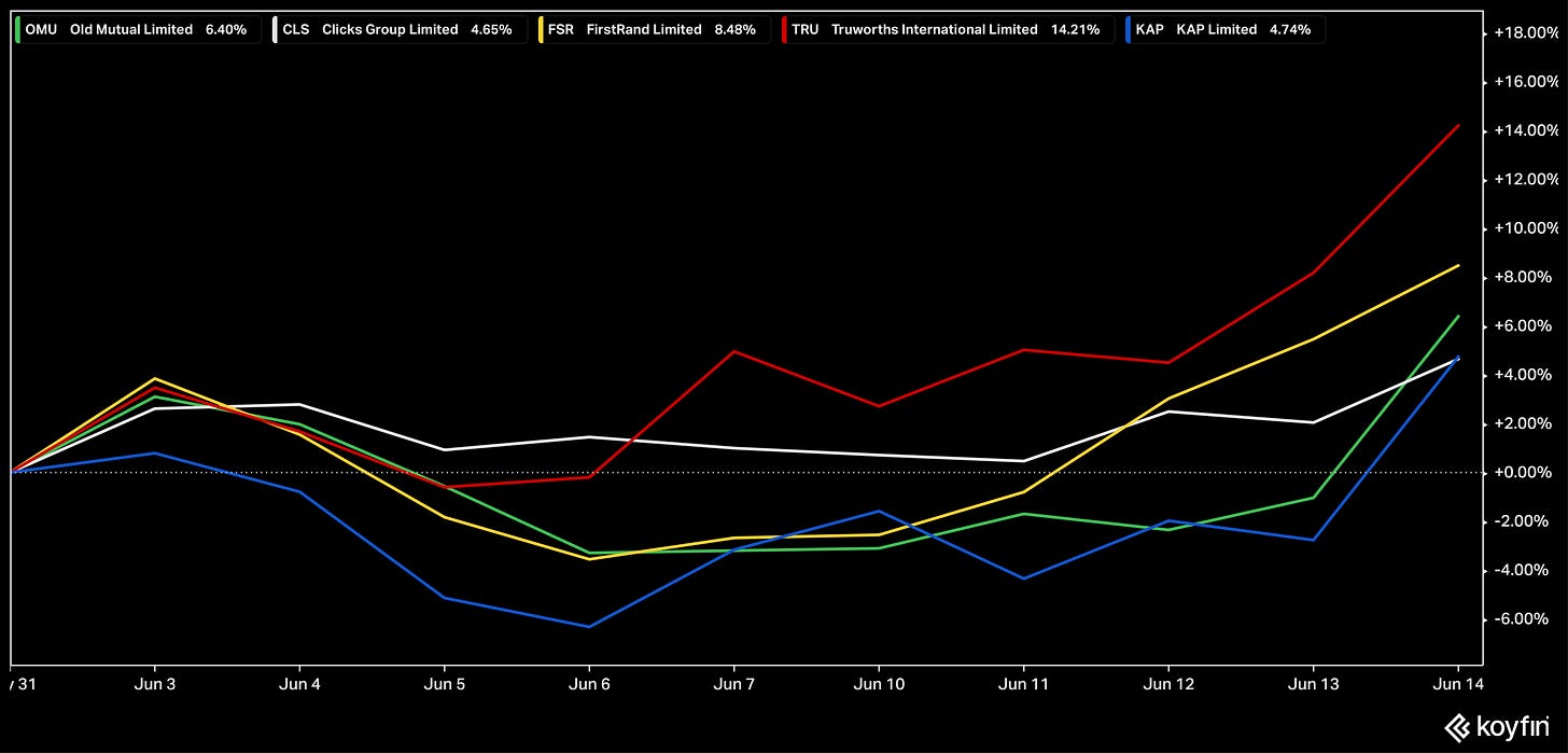 Insurers, banks and retailers look set to outperform (more on some specific trades later). Some of the best performers this week were Old Mutual, Clicks Group, FirstRand, Truworths and KAP.