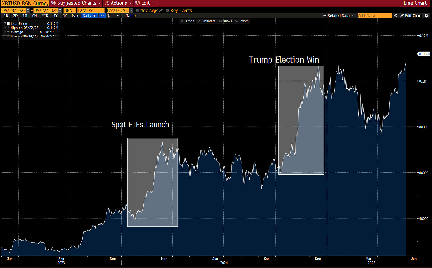Since April 10th, Bitcoin has surged over 50%, briefly trading just below $112,000 on Thursday, a new local high that surpasses the January peak.