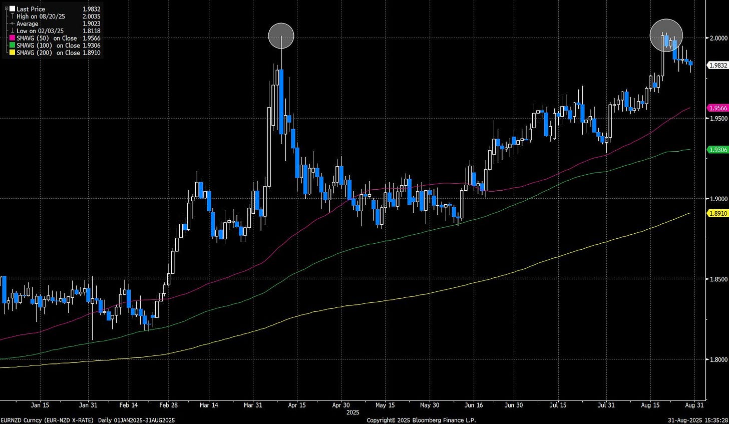 From a fundamental view, the recent RBNZ cut and the weak labour market (unemployment back to pandemic levels) spell trouble for the coming months, so we like to play a short here.