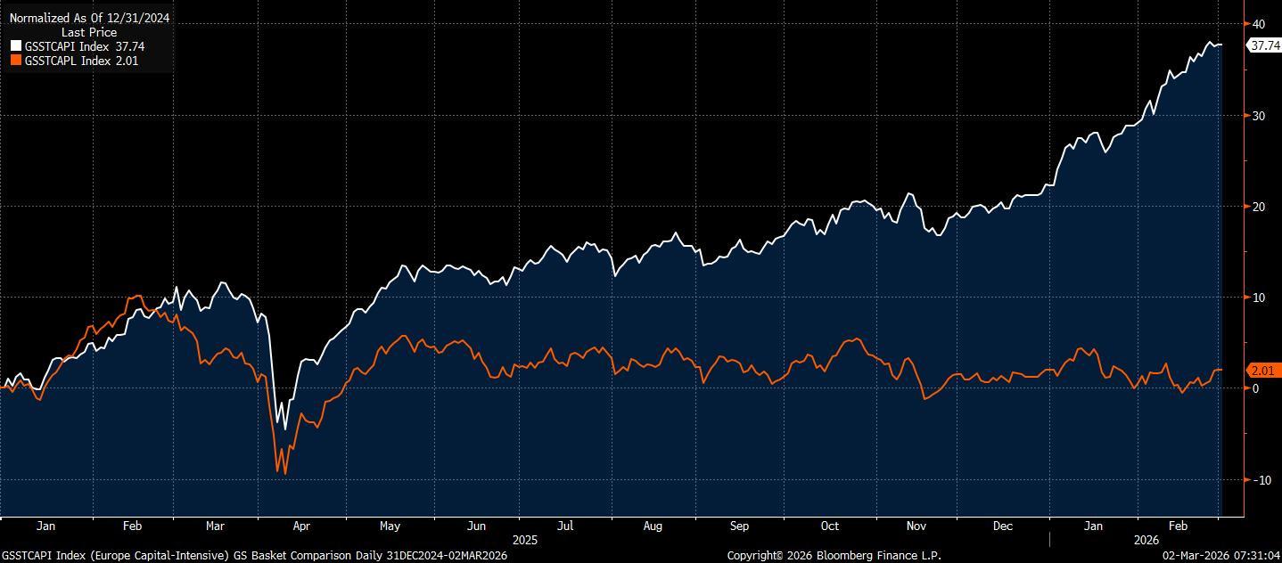 Defensive sectors outperformed decisively. Utilities, staples and healthcare attracted capital in what looked less like a tactical rotation and more like a regime hedge. Goldman Sachs’ HALO basket (heavy assets, low obsolescence) has now outperformed capital-light peers by roughly 35% year-to-date. The market is increasingly rewarding tangible asset bases and pricing power over growth narratives tied to human or digital capital.