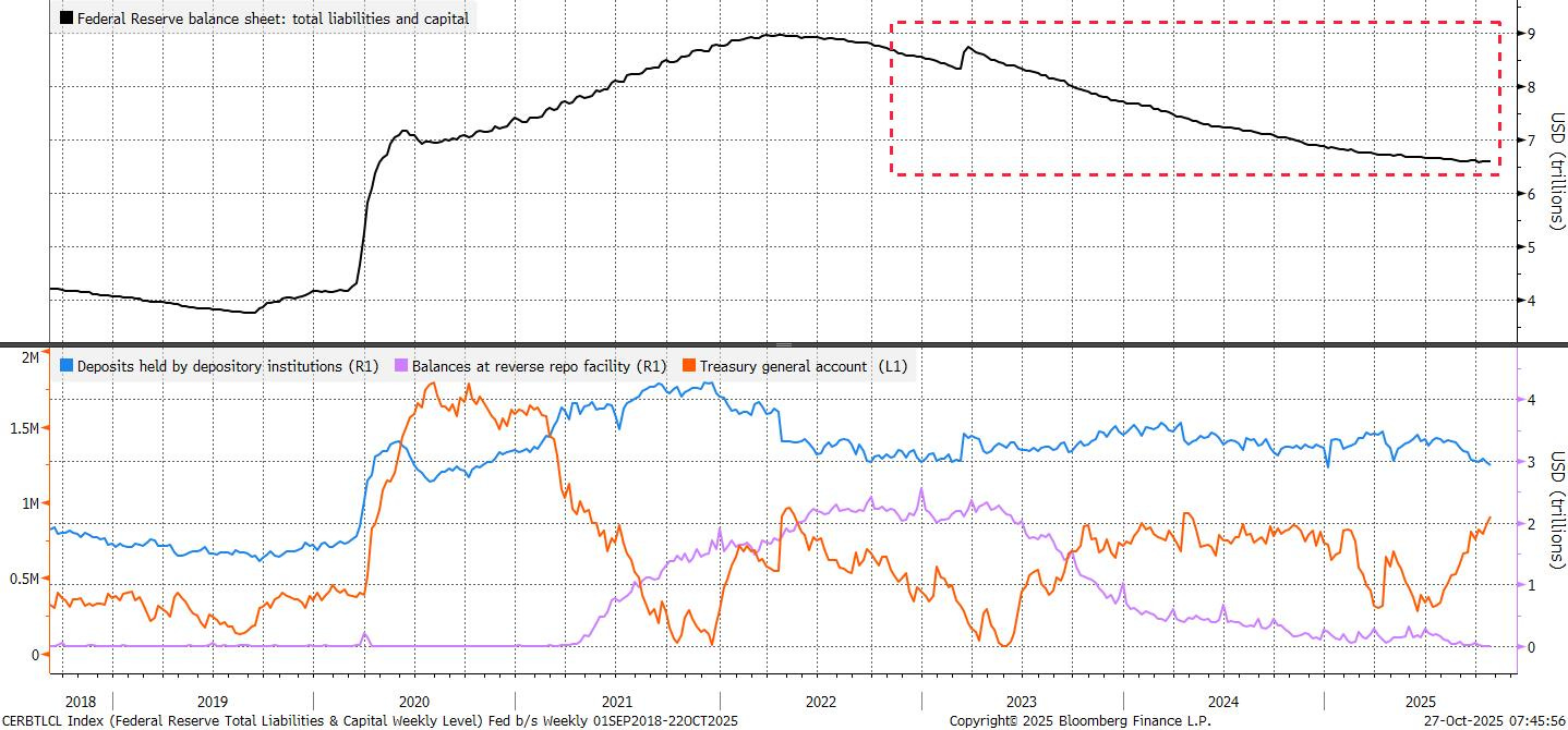 Elsewhere, focus in the week ahead will remain on US monetary policy, where the Federal Reserve is expected to deliver another 25bp rate cut. The market’s attention will be on how the Fed frames the path forward rather than the cut itself.