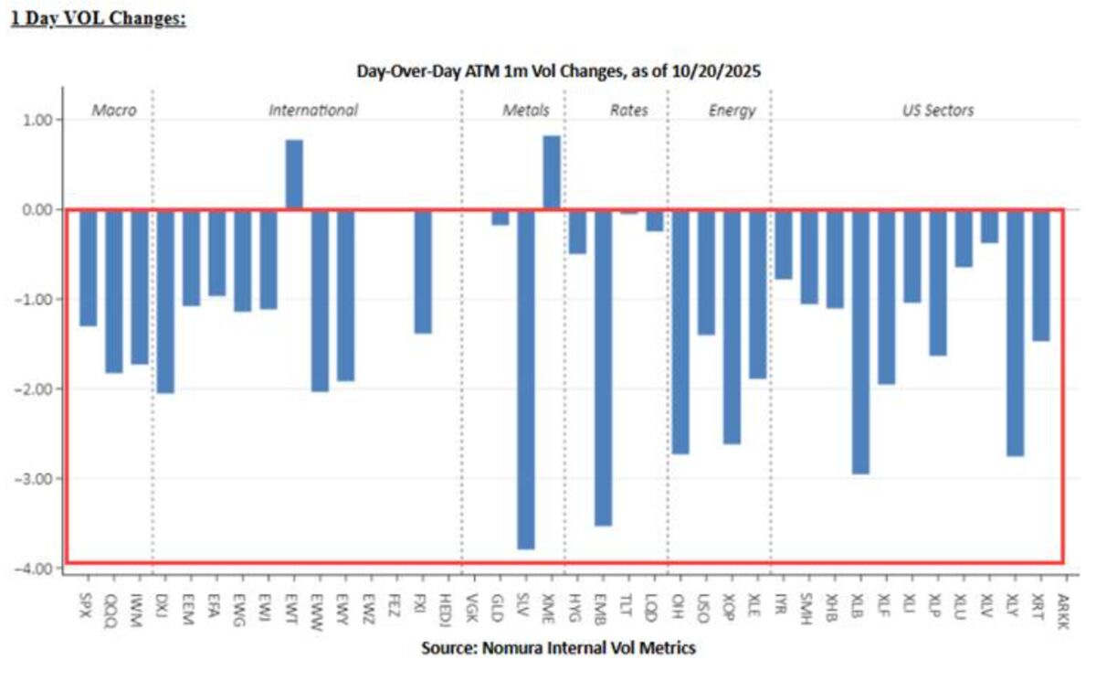 The macro backdrop remained muted with the Fed in blackout and the shutdown freezing official data releases. Markets instead defaulted to sentiment and positioning. Nomura noted that the surge in short volatility trades has acted as a shock absorber, muting any downside pressure.