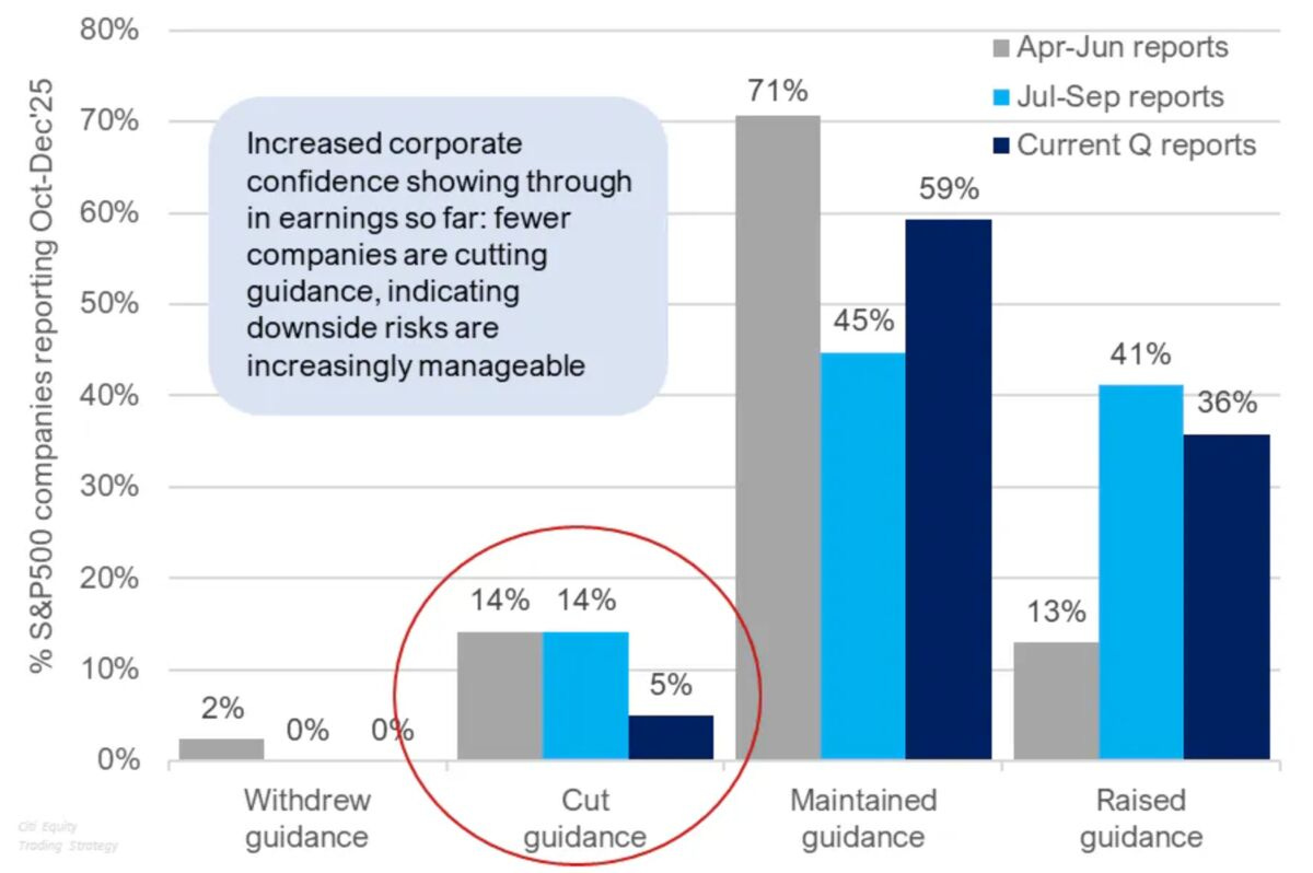 Corporate results continued to reinforce the bullish tone. Tesla and GM both delivered upbeat earnings, giving the consumer discretionary sector a lift, while AI-linked optimism kept tech firmly in charge. Citi pointed out that only 5% of S&P 500 firms have cut forward guidance so far this quarter, well below the 14% average of recent seasons, suggesting earnings resilience is extending the cycle.