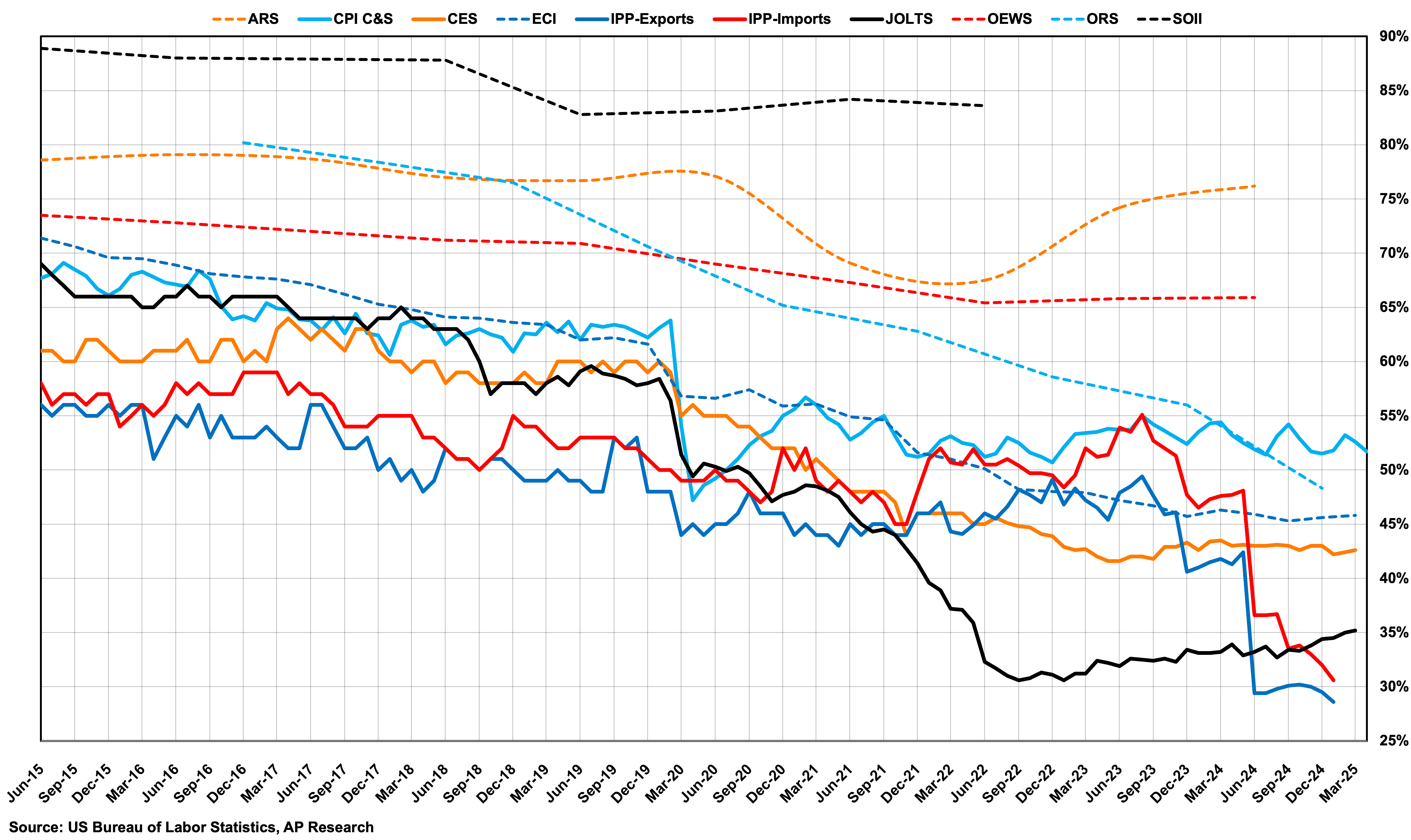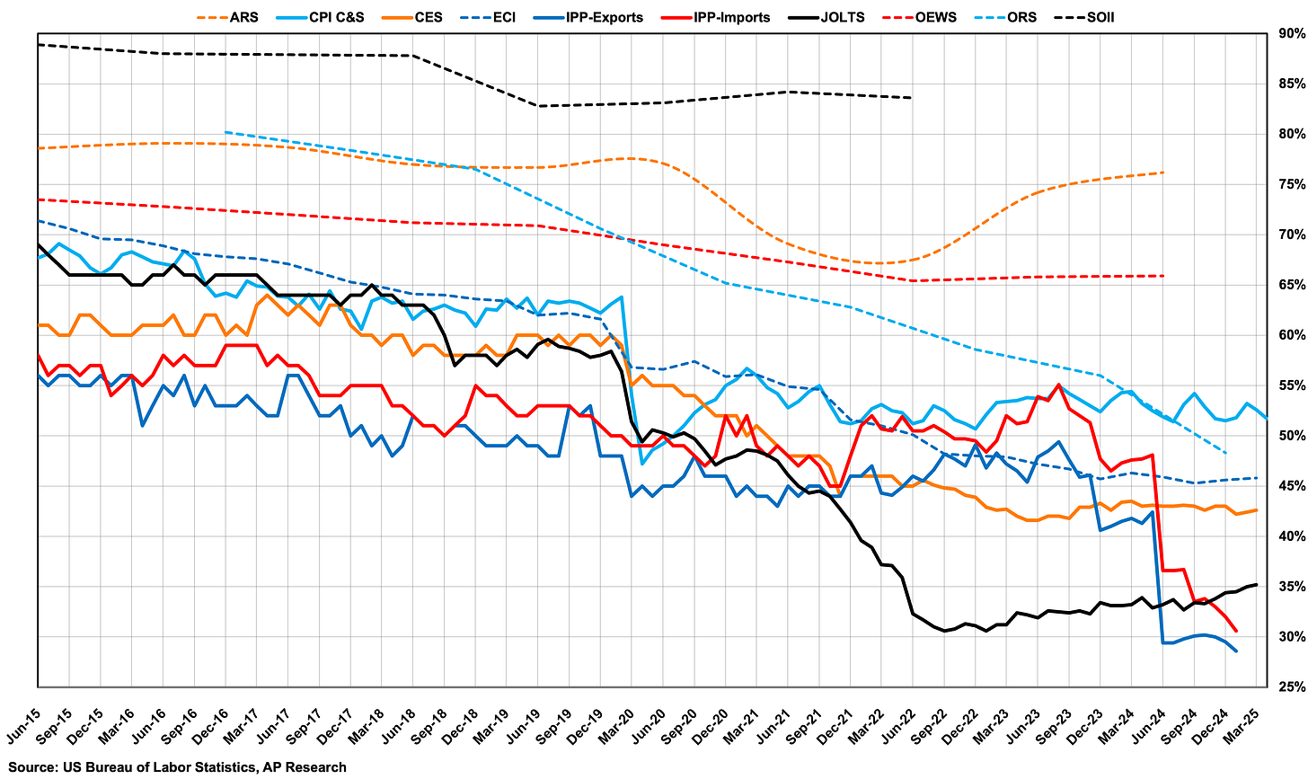 The BLS relies on voluntary surveys to compile its data. With response rates in free fall (down to just 35% for the March report), survey-based data is becoming less reliable. This issue is not isolated to the BLS; it extends across most survey-based data sources. The public’s decreasing willingness to participate in surveys means that the BLS’s job reports are increasingly delayed, and their accuracy is compromised.