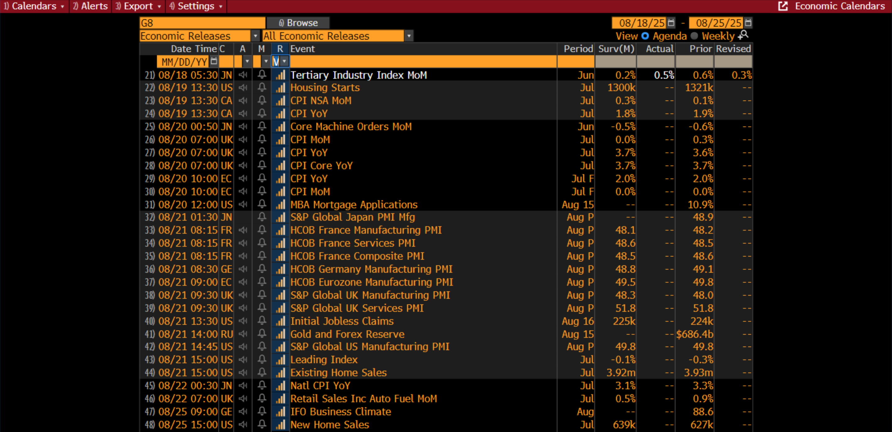 In Europe, the UK releases July inflation data on Wednesday, the key test for whether the BoE can sustain its easing cycle. June’s overshoot forced markets to scale back expectations for further cuts, and another upside surprise could derail November cut pricing. Thursday brings preliminary PMIs across Europe, the UK, and the euro area, the first clean look at tariff effects on activity. Eurozone flash consumer confidence is due the same day, followed on Friday by Germany’s detailed Q2 GDP release and France’s business sentiment survey. In Sweden, the Riksbank decides policy on Wednesday and is expected to hold rates steady at 2%, though policymakers remain open to cuts if the growth shock from tariffs deepens.