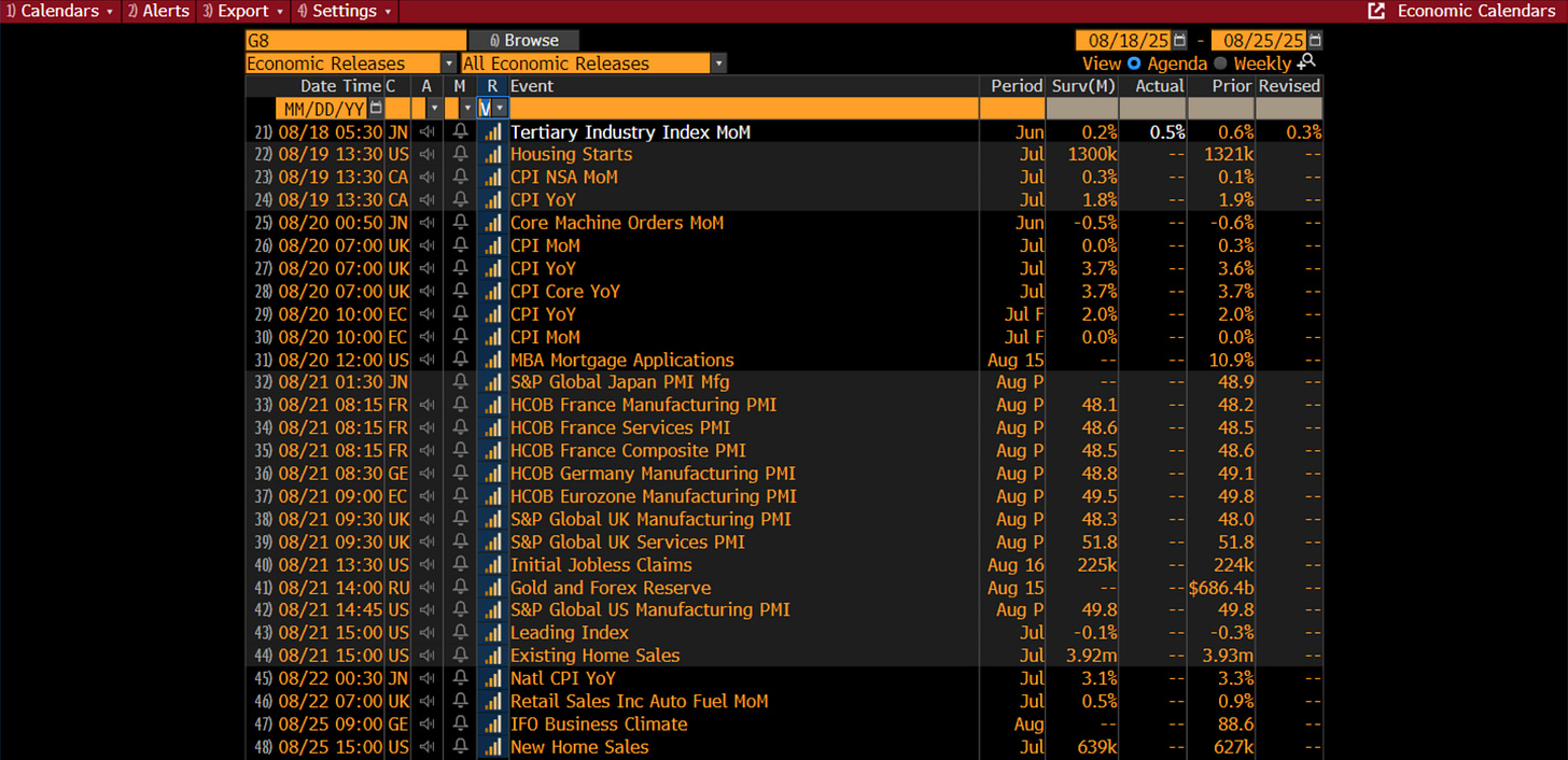 The most consequential emerging-market prints come from Canada and China. Canada’s July CPI (Tuesday) is pivotal for the BoC’s September call, especially after soft jobs data. In Asia, China’s PBoC rate decision (Wednesday) is widely expected to leave lending benchmarks unchanged, with targeted credit support still the preferred easing channel.