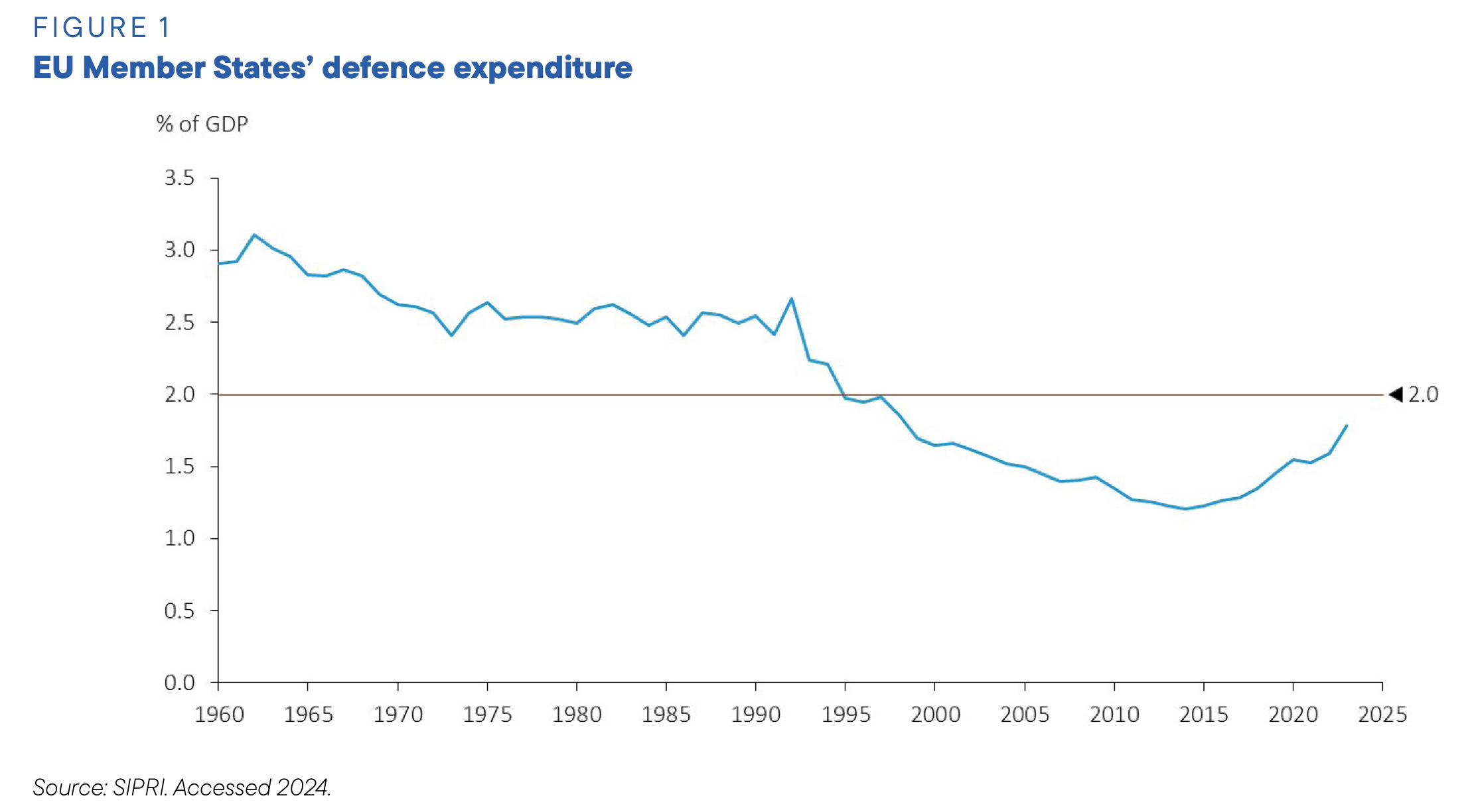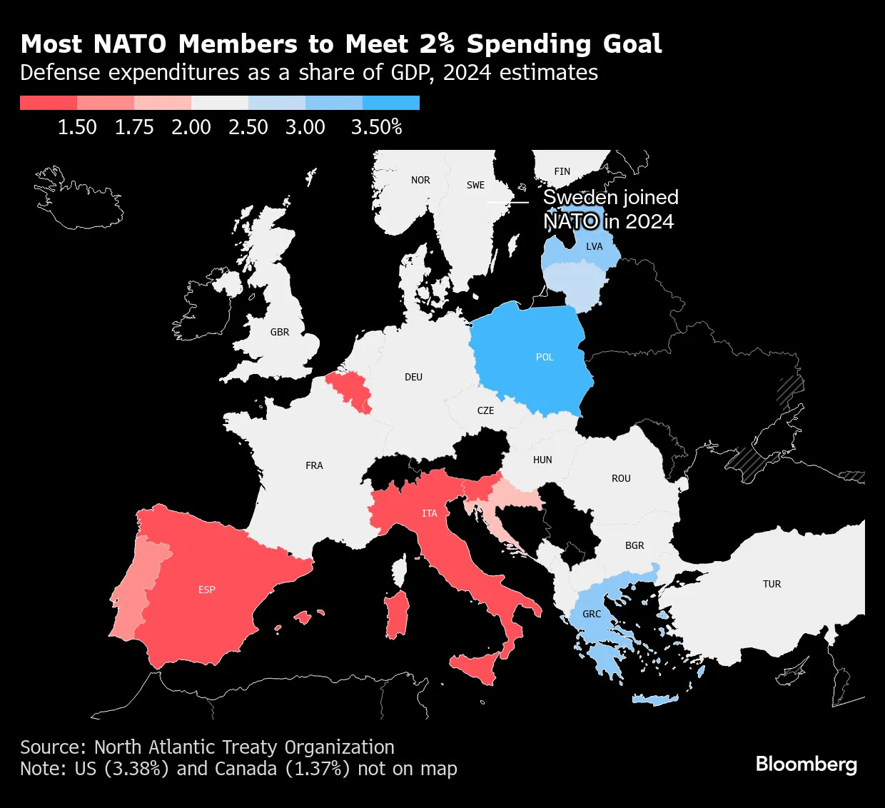 The exact scale that Europe can up its military spending is unclear. The Trump administration is pushing a 5% of GDP agenda, but something around 3% is a more likely outcome. 2024 figures came in at just 1.9%.
