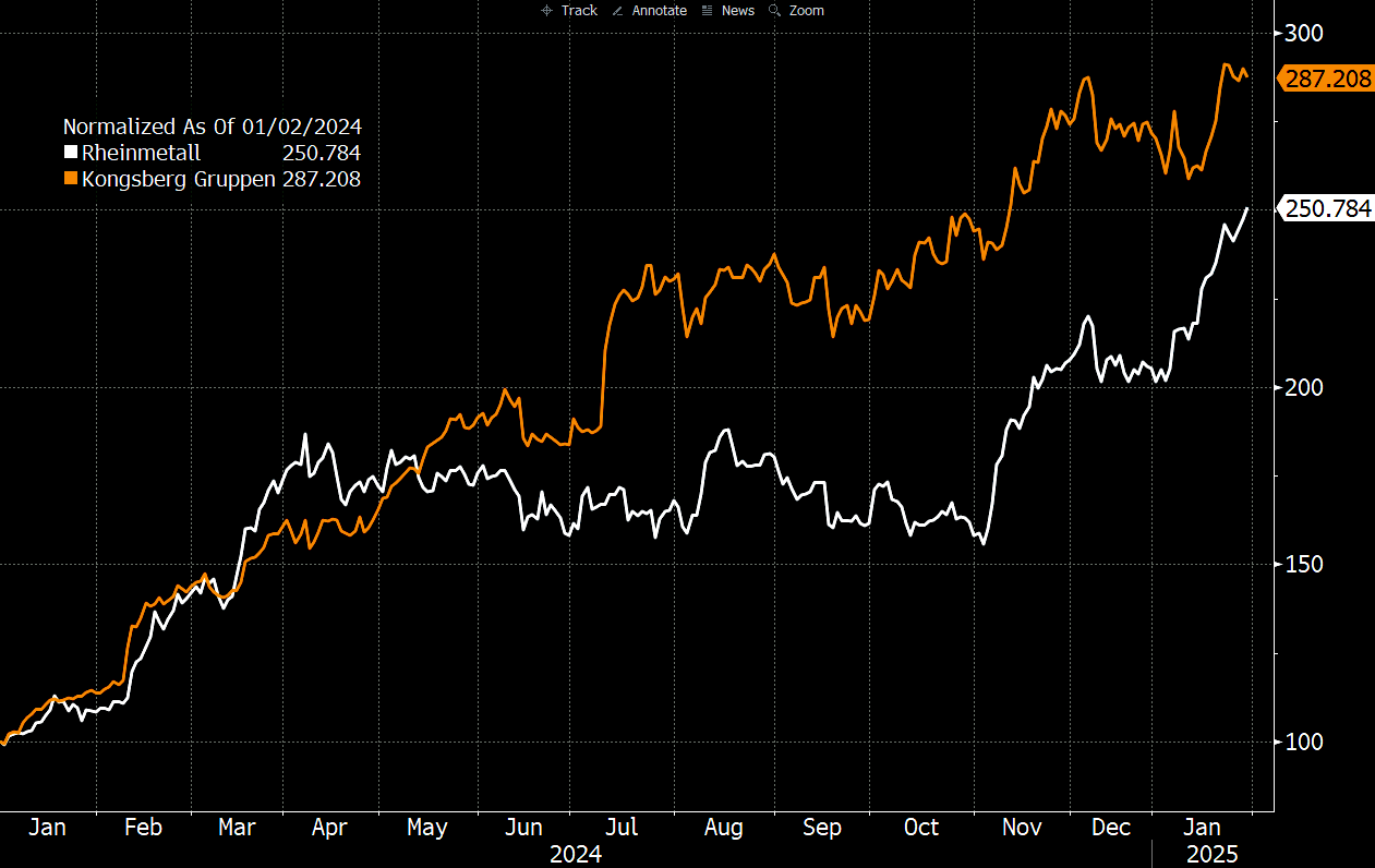 Investors have picked up on the trend of defence spending. Among the four best-performing stocks in Europe over the past year are Germany’s Rheinmetall, known for manufacturing battle tanks, and Norway’s Kongsberg Gruppen, which specialises in missile production.