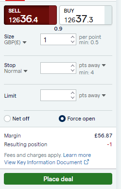 But what about our important notional size? Well this is £12,636. You can work this out by doing £1 x 12636. Or you can figure that if £56.87 is 0.45% of the position size, then 100% is £12,636.