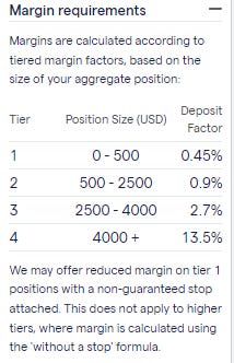 The initial margin figure can be seen as £56.87. We know from the margin requirements (see below) that this has a deposit factor of 0.45%. This all makes sense, as 56.87 / 0.45% = 12637.