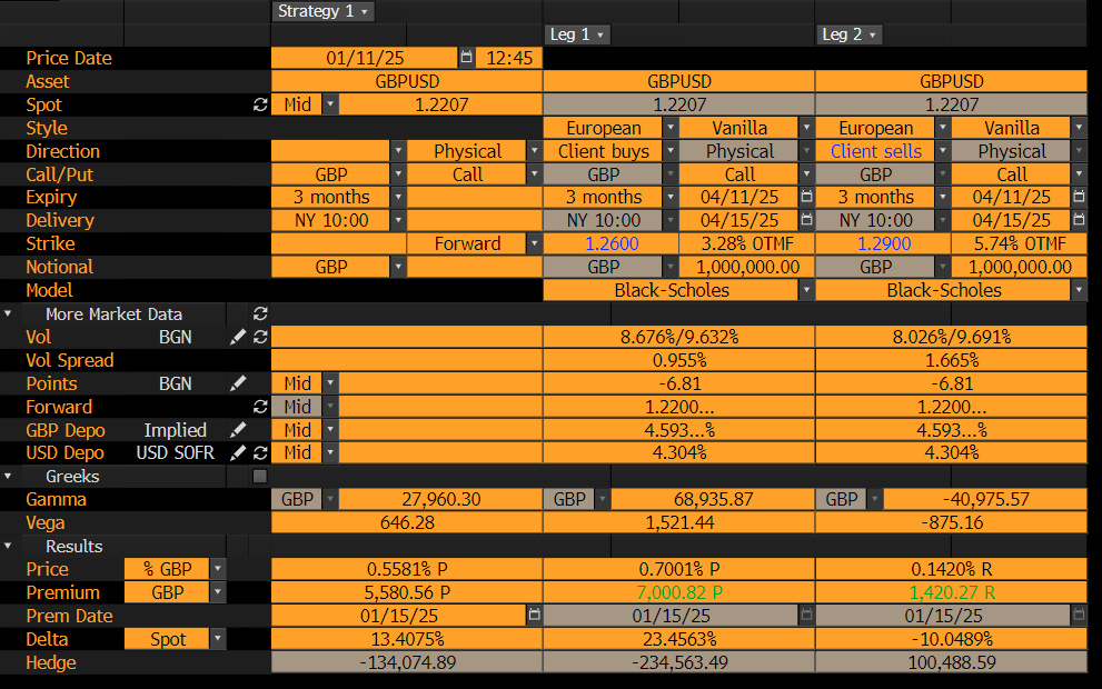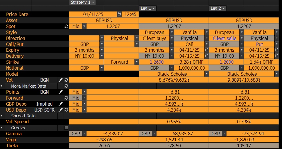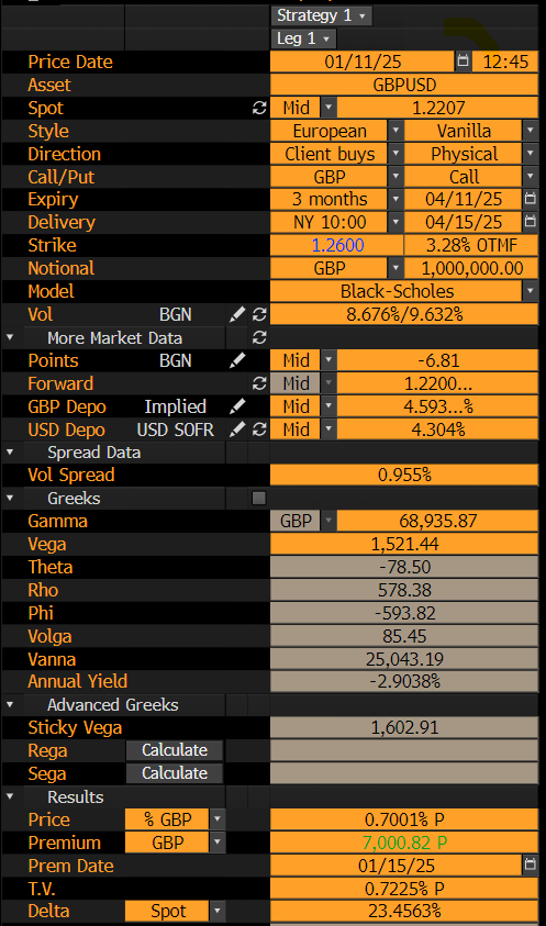For each of the Greeks, we’re going to explain them using a priced-up trade, namely a GBP/USD vanilla call option with a 3-month tenor, spot at 1.2207 and the strike OTM at 1.2600.