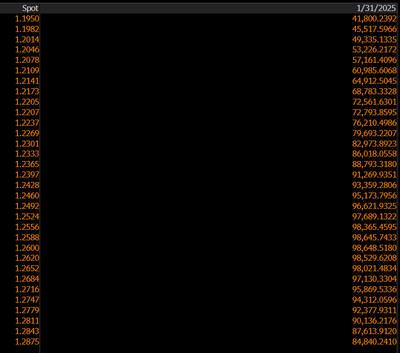 Look at the gamma exposure versus spot movements in GBP/USD based on where spot could be at the end of this month: