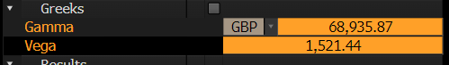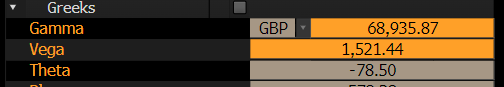 So, our initial gamma for this OTM strike option is circa £69k. This means that if spot moves 1% higher, the rate of change of our delta would amount to £69k. Put another way, if spot jumped by 1%, we’d need to sell another £69k in order to keep ourselves delta-neutral.
