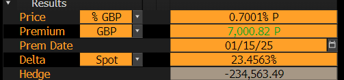 It gives us a NEGATIVE hedge position of £234k. This should look familiar, given that it’s the same percentage as the delta above it, just converted based on our notional amount. It means that we would sell £234k of the underlying (i.e. a spot trade selling GBP buying USD), which would make us delta-neutral.