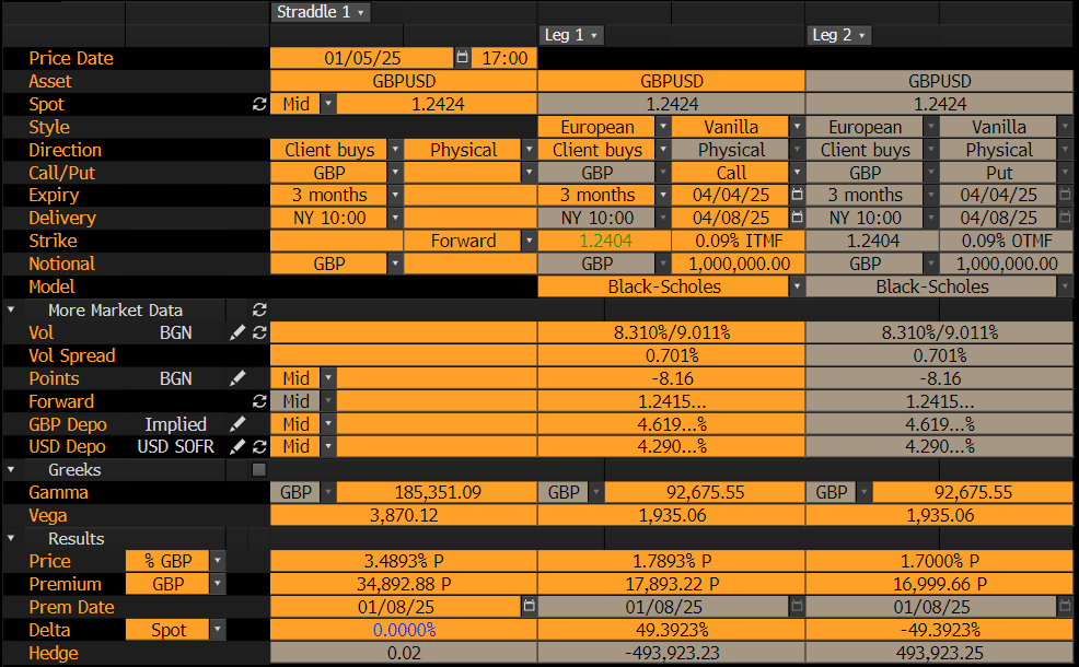 In this case, we’ve bought a 1.2404 strike call and a 1.2404 strike put option. The delta is almost 0.5 for the call and -0.5 on the put. So, our net delta is 0. The trader wouldn’t be negatively impacted by spot moving in one direction. Rather, if it was a volatile move (in either direction), the trade would be profitable.