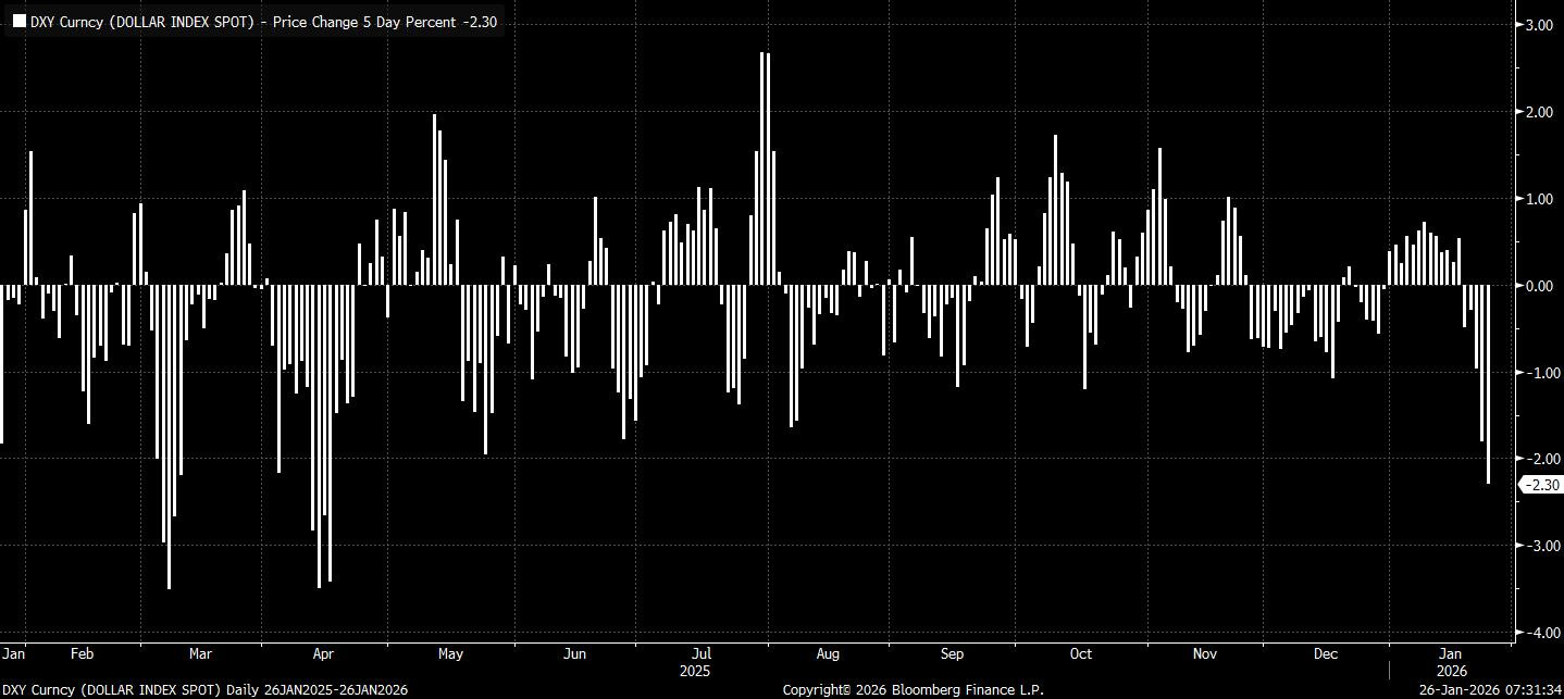 US equities were briefly shaken after President Trump escalated rhetoric around Greenland, threatening tariffs on allies and reviving fears of a broader geopolitical fracture. The S&P 500’s sharp drop on Tuesday reflected that anxiety, but it never evolved into a sustained “Sell America” moment. Instead, the pressure was most evident in FX. The dollar took the full brunt of the move, posting its weakest week since May, while equities proved more resilient. A softer USD, in turn, offered relief to megacap tech and capped downside follow-through.