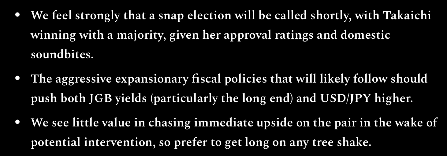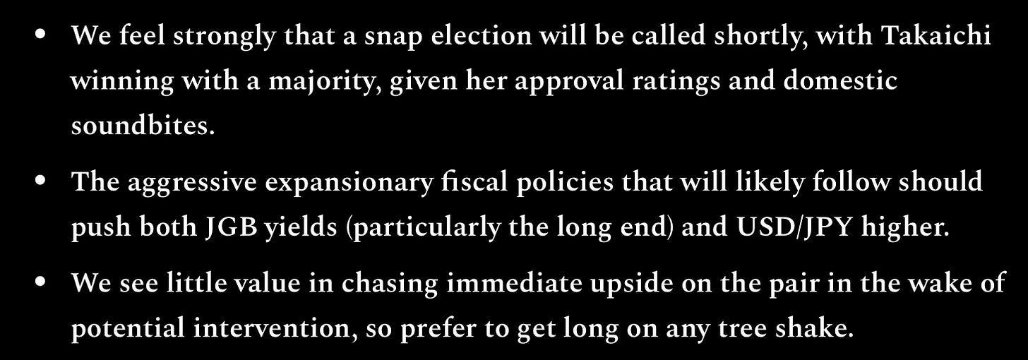 However, it wouldn’t be fair to say that there was no follow-through on the other side of the world: Japan. Prime Minister Sanae Takaichi helped roil markets with an election pitch to cut taxes despite the country’s sizeable debt burden and elevated inflation. Long-end yields flew higher to multi-decade highs as JGBs continued to be sold.