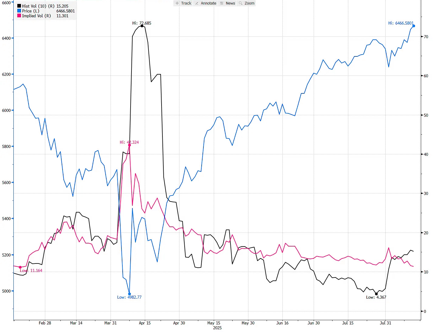 The VIX has fallen to the lowest level since Dec 24th 2024, at 14.3, coinciding with the S&P 500 hitting fresh ATHs. Earlier this week, ten-day implied vol dropped below realised volatility, essentially indicating that any immediate future concerns about a sell-off have been almost completely discounted.