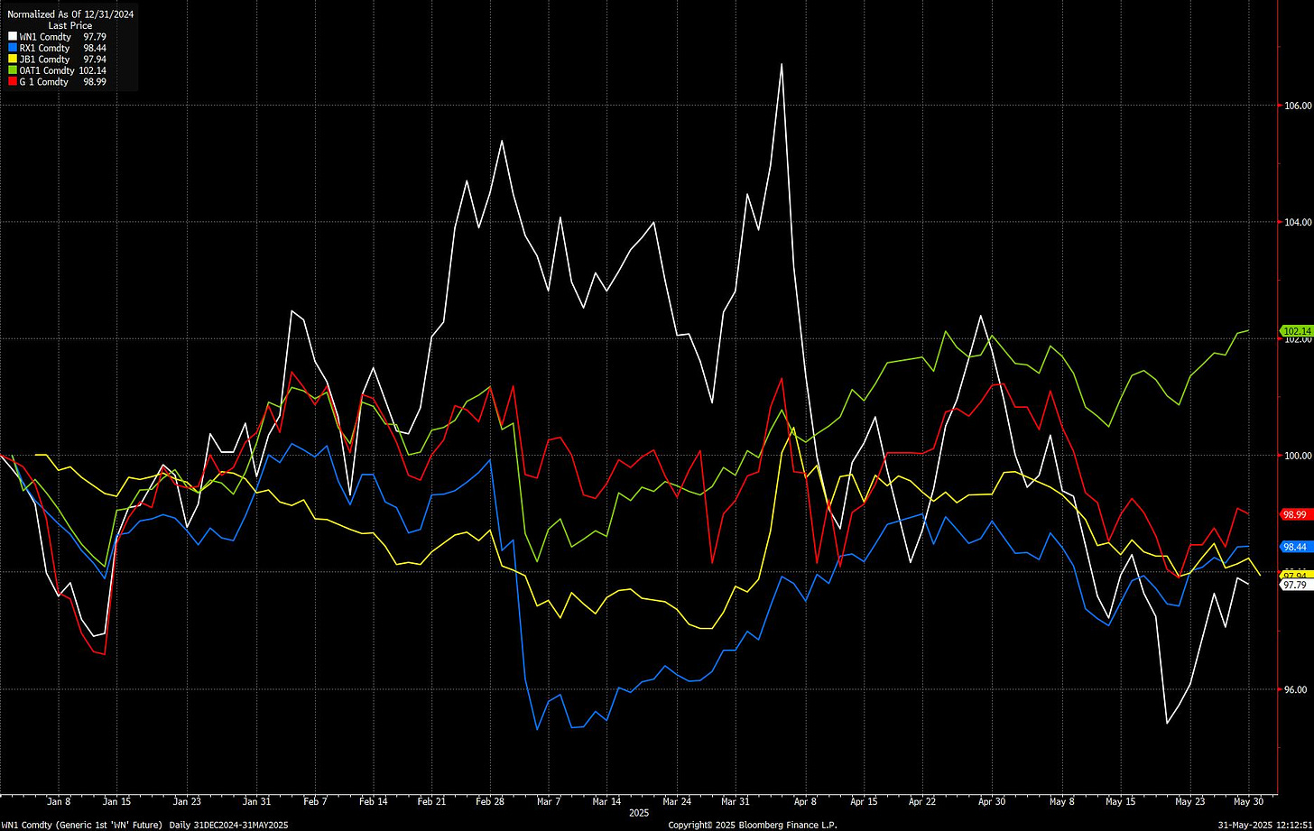 Across the Atlantic, Europe’s bond complex is proving more resilient. Gilts, OATs, and bunds have been outperforming Treasuries, buoyed by more anchored inflation expectations and a political backdrop that, while noisy, lacks the same direct fiscal fuel. The macro risk of Trump’s tariff threats remains, but the market’s working assumption is that Europe’s negotiating leverage and internal cohesion will keep a lid on US-inspired volatility, at least for now.