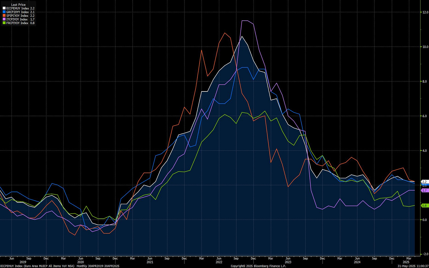 In the Eurozone, inflation prints steadied, with Spain at 2.2%, Germany at 2.1%, Italy at 1.7%, and France dropping to just 0.8%.