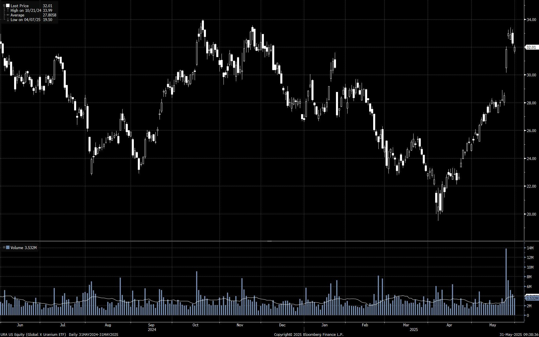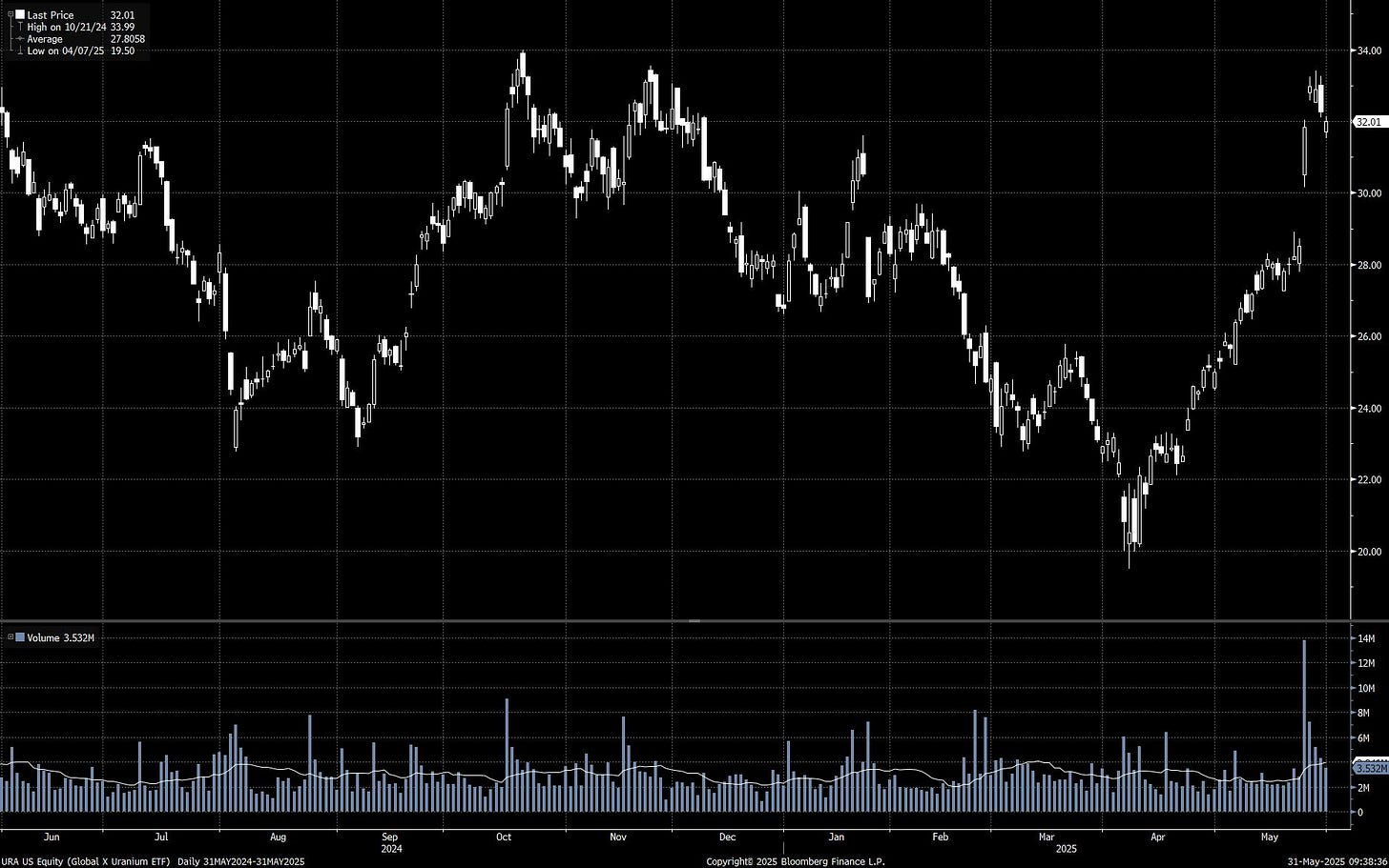 An interesting commodity that flashed across major headlines in May was Uranium. Both contracts on the heavy metal and uranium-linked companies such as miners saw a significant move up on the back of news on Trump’s nuclear revival plans, the latter demonstrated by the ‘Global X Uranium’ ETF (URA ticker) price chart below.