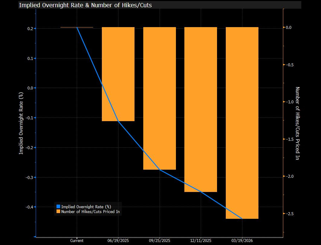 The next SNB meeting is scheduled for the 19th June, with rates pricing finely balanced between a 25bps and a jumbo 50bps at 31.5bps.