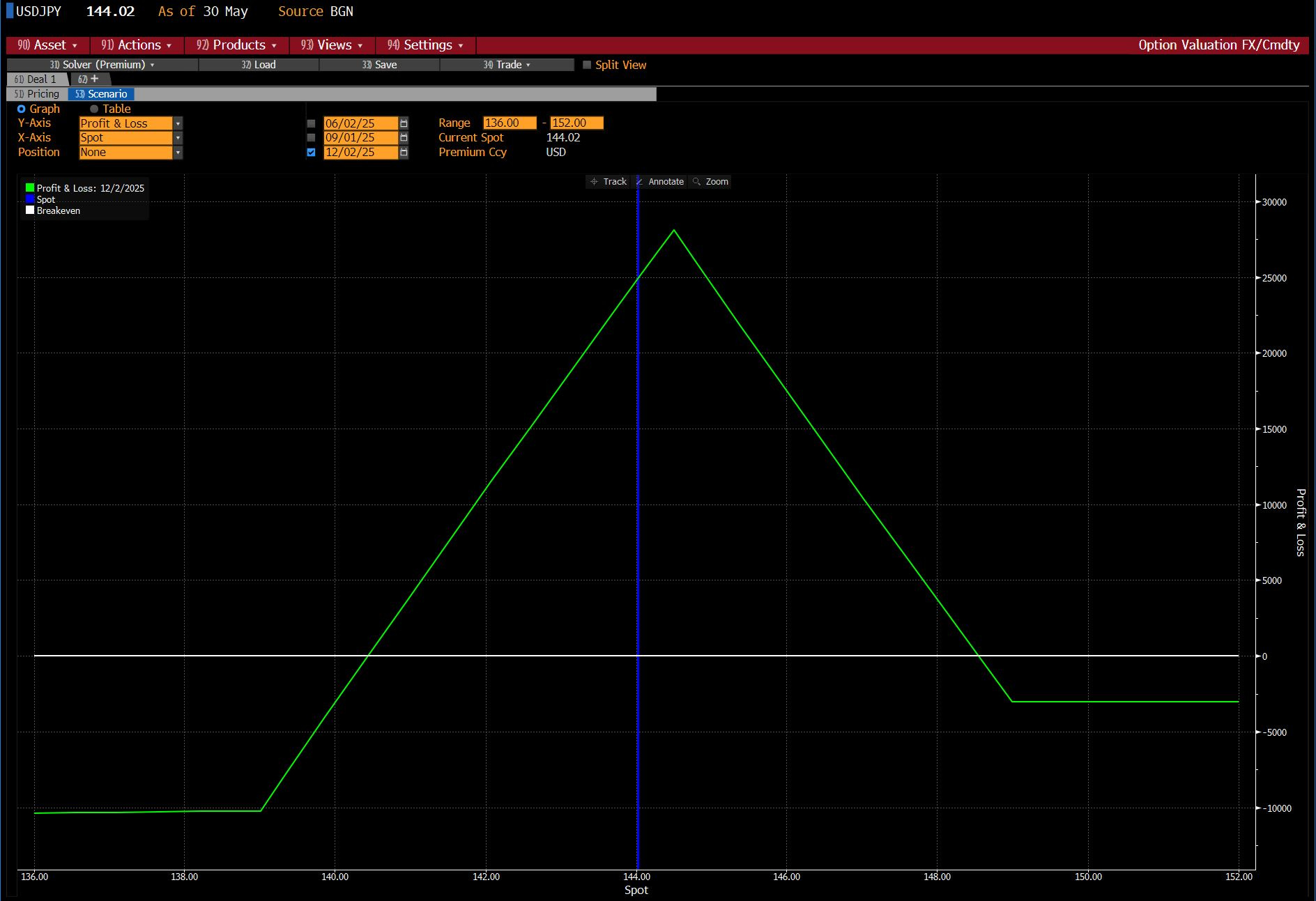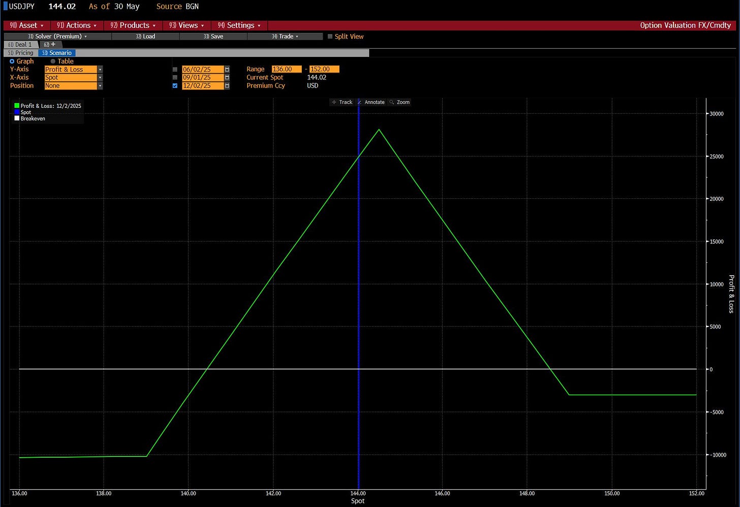 Trade 2: USDJPY 6-month Broken-Wing Put Fly 149/144.5/139. Long 1× 149 put, short 2× 144.5 puts, long 1× 139 put.