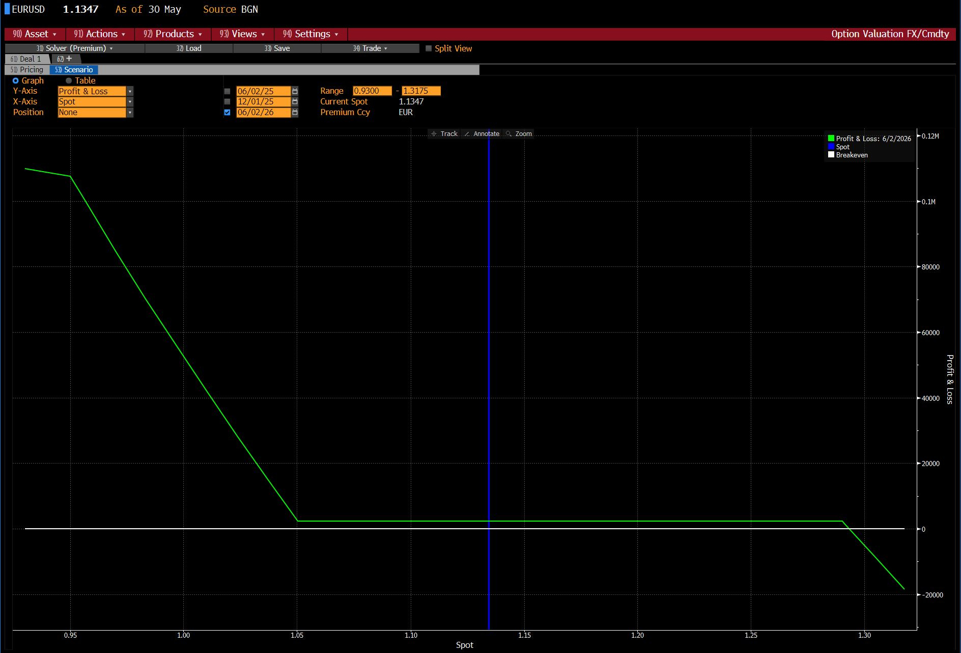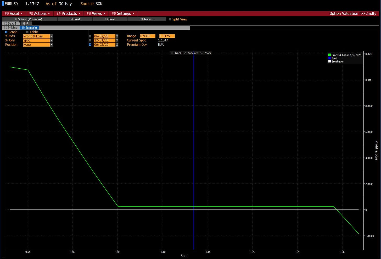Trade 1: EURUSD 12-Month 1.29/1.05/0.95 Seagull Structure: Long 12M 1.05 put, short 12M 1.29 call, short 12M 0.95 put; zero-cost ±15 bp vol. Target 0.97, hard stop 1.13.