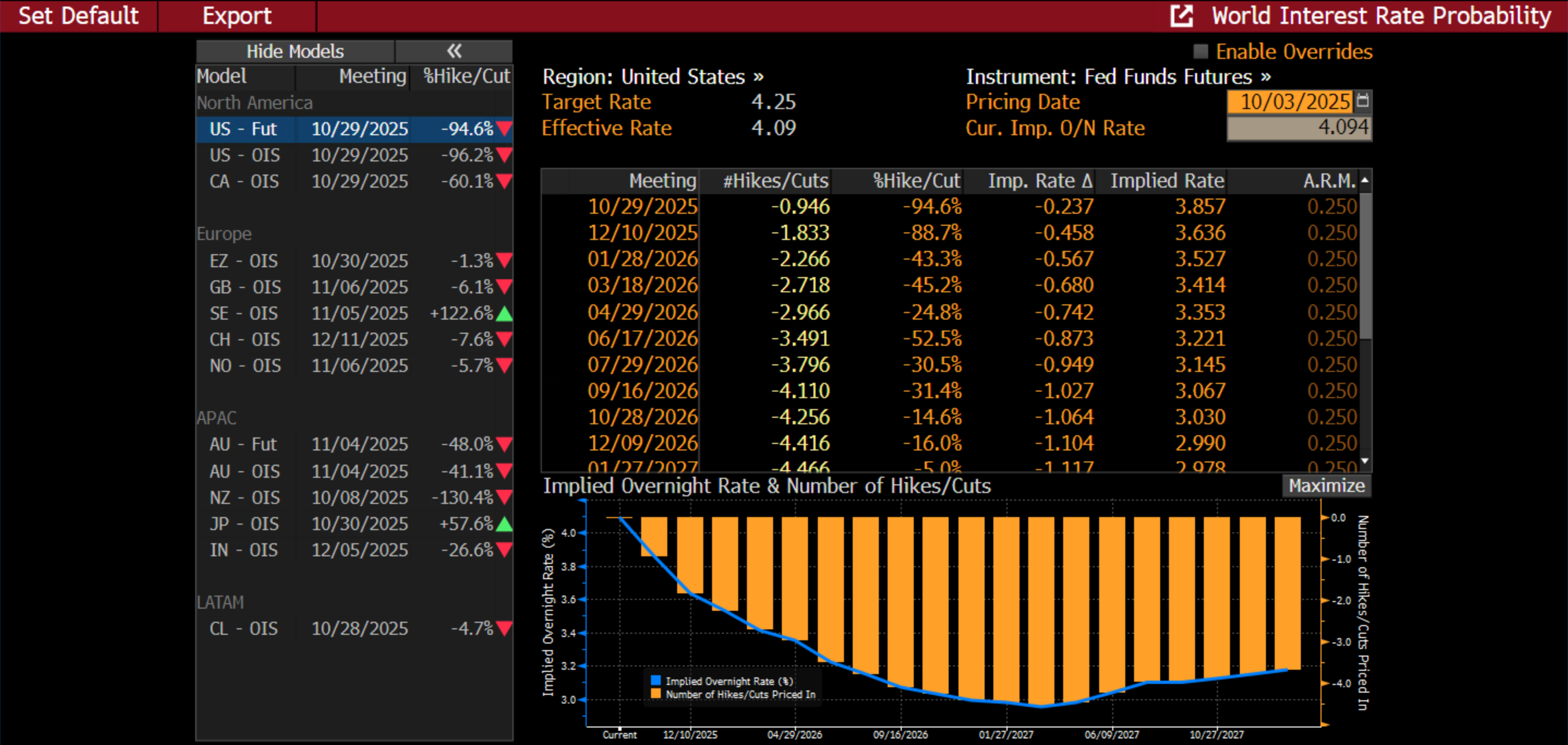 That fragility is already visible in the labour market. The ADP private payrolls report for September came in with a surprising -32,000 job loss (following a revised -3,000 in August), the largest monthly drop since March 2023. This weak reading, especially in a month where the official BLS nonfarm payrolls release was delayed by the government shutdown, sharpens scepticism about labour resilience and re-energises the case for further rate cuts. With hiring decelerating even inside private payrolls, the Fed’s “data dependence” posture will be tested more than ever in October.