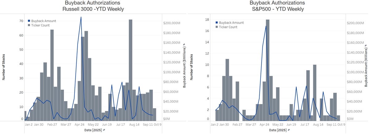 Corporate demand, the quiet tailwind, is temporarily on pause. The buyback blackout window began last week and will last through much of earnings season. But once companies exit blackout, the scale of potential demand is formidable. EventVestor data show over $1.3 trillion in announced authorisations year-to-date, the fastest pace on record. The return of buybacks will coincide with the seasonal pickup in retail demand and the typical late-year risk appetite recovery, creating a synchronised tailwind into year-end.