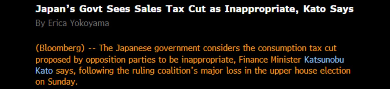 Opposition-driven fiscal expansion is now on the table. With inflation still elevated by Japanese standards and wage growth lagging, calls for fresh stimulus (especially via consumption tax cuts) are gaining traction. Even if Ishiba’s government retains lower house control and can prevent a radical shift, the path of least resistance may be to accommodate, not confront, these demands. But that isn’t a path Ishiba wants to take.