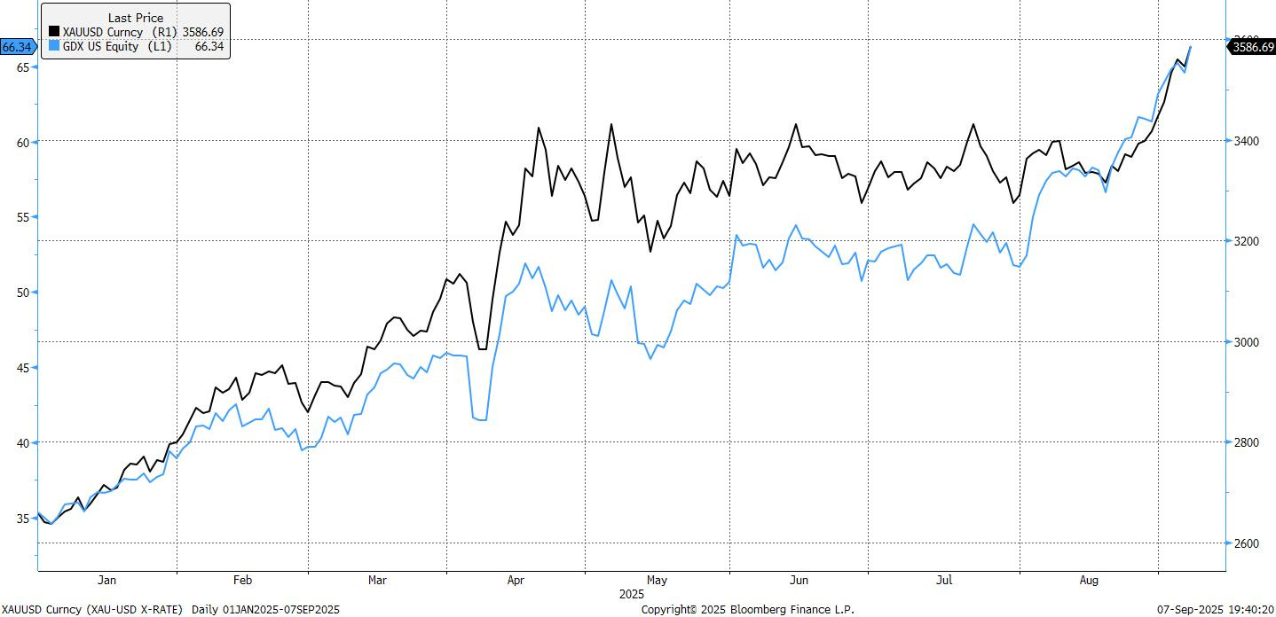 The dollar followed a familiar pattern: early strength tied to yields, then faded as weak jobs data reasserted the rate-cut narrative. USD/JPY and GBP/USD were choppy on local stories, while EUR vols stayed inverted, pointing to more near-term activity. Treasuries shifted lower in parallel, shrugging off global supply concerns as rates vol collapsed. Gold surged to fresh record highs near $3,600/oz, supported by USD weakness, geopolitical risk, and tight physical supply, a move that helped miners extend their strong year-to-date outperformance.