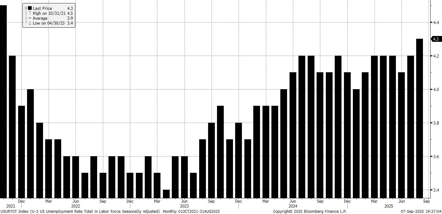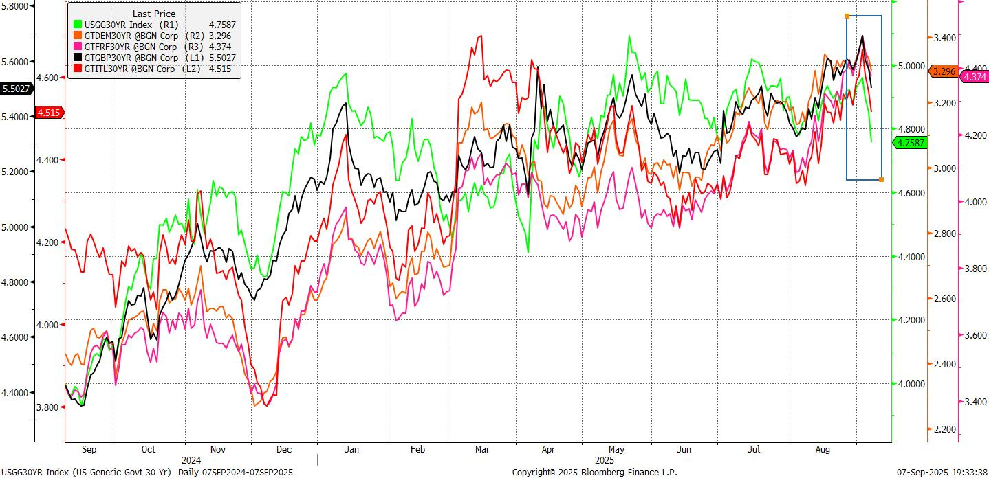 The macro picture continues to lean dovish. August payrolls badly missed at just 22k, with unemployment ticking up to 4.3%. Combined with Powell’s dovish tilt last week, markets now see September as a lock, with nearly 70bps of easing priced by year-end. Waller and Bostic underscored the case for near-term action, pushing policy expectations deeper into easing mode.