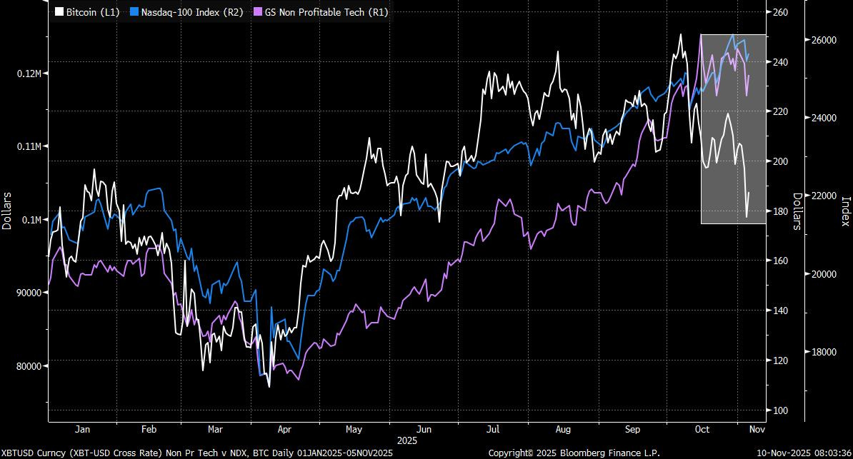 A late-week bounce helped the S&P 500 trim losses as Washington signalled a restart in negotiations to end the shutdown, providing at least a temporary reprieve for sentiment. Energy names led the market as crude prices held firm relative to other risk assets, while crypto saw one of its sharpest drawdowns in months. Roughly $45 billion in Bitcoin has been sold since Oct. 6, an echo of the deleveraging seen in tech as investors take profit in the year’s most crowded trades. If you think that crypto is the tip of the spear for investor animal spirits and risk appetite, it’s probably worth paying attention.