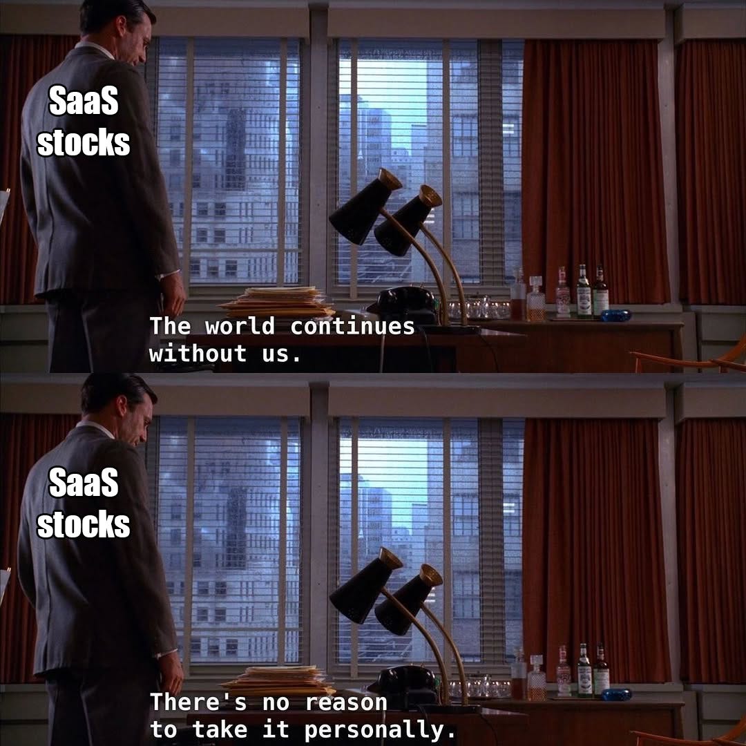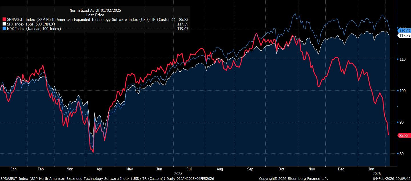 The AI trade, however, has turned the page to a harsher chapter. Over the long arc, artificial intelligence should be pro-equity, and we believe it will be: productivity up, margins up, multiples justified. In the meantime, it is indiscriminately killing SaaS stocks.