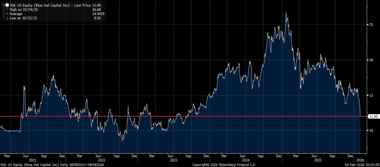 The other casualty is private equity’s decade-long software binge, something credit desks have started calling “Loan-aggedon.” Wall Street’s largest alternative-investment firms are under pressure, driven by fears that artificial intelligence-driven disruptions would cause steep losses on their books. Blue Owl (OWL US), built on financing software businesses and a name we hold short exposure to in the portfolio, now trades where it last did in September 2023.