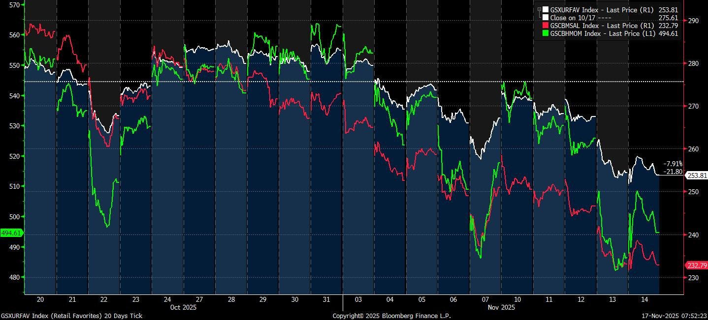 Thursday’s selloff was particularly severe, a heavy hit to momentum and retail-heavy baskets. Bank of America’s High-Momentum Index fell 4.7% (its worst day since April), while Citi’s Retail Favourites basket sank 6%. Even heavily shorted names weren’t spared, as Goldman Sachs’ Most-Shorted Index dropped 5.5%.