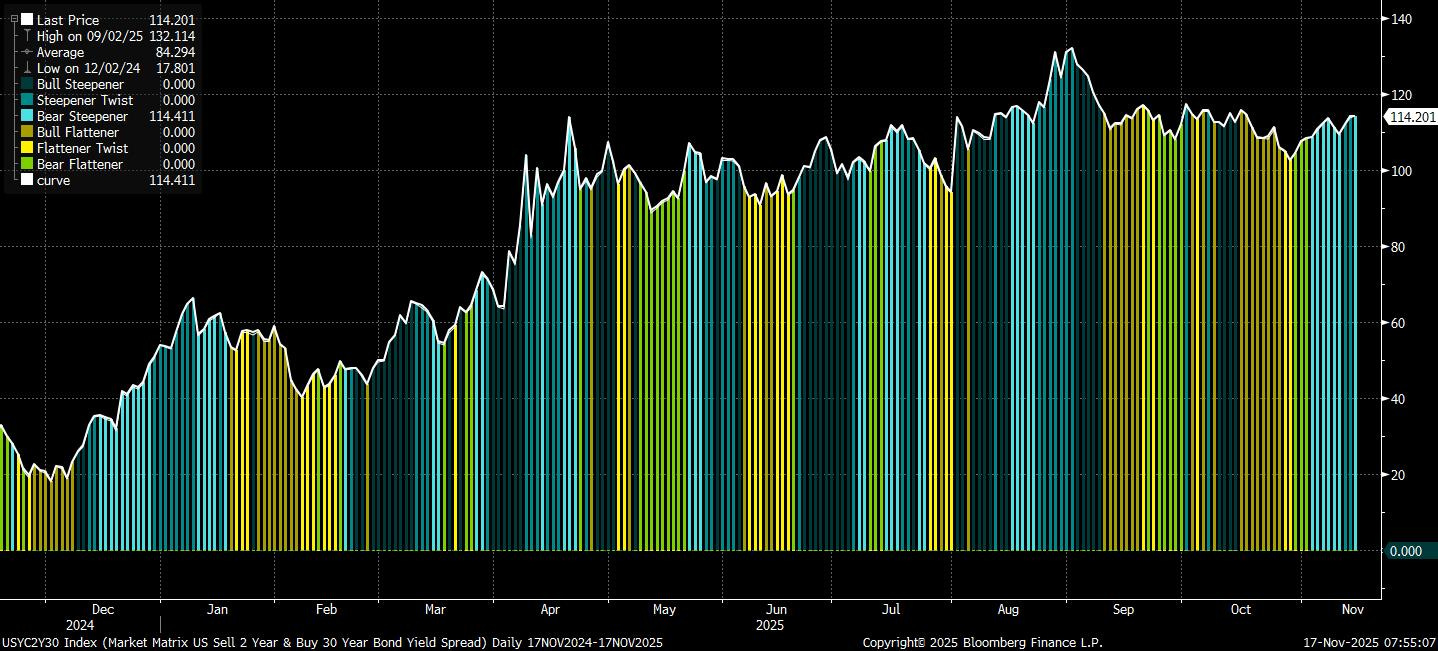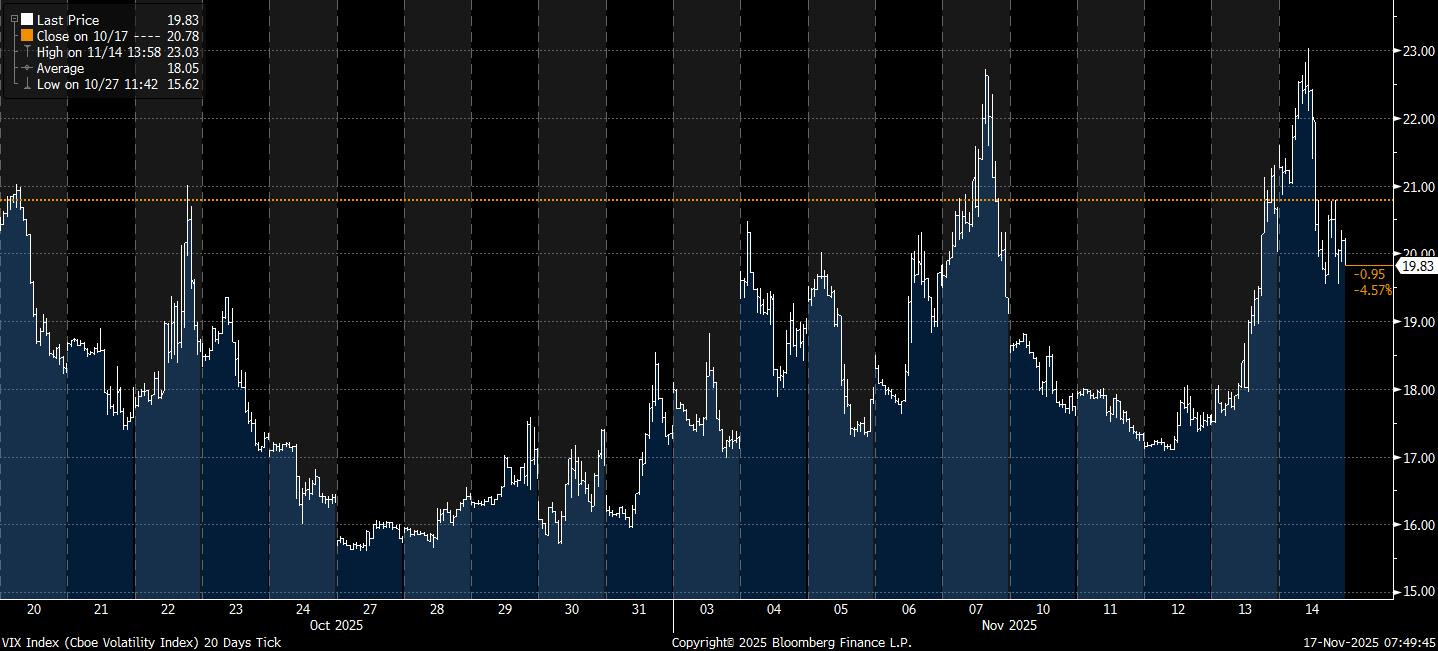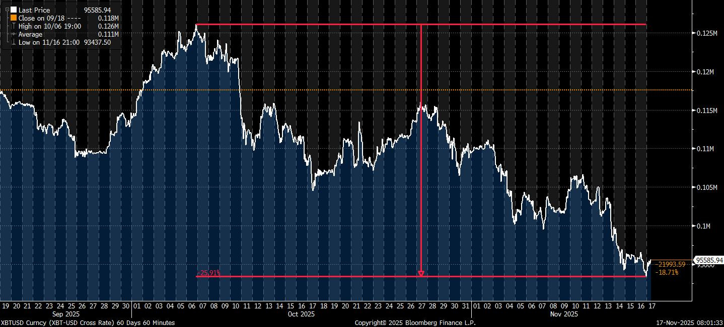 Health care and energy led, while consumer discretionary and rate-sensitive sectors lagged. The lack of fresh US data continued to leave markets adrift, depriving investors of the macro validation they’ve grown used to anchoring trades around. Meanwhile, crypto assets extended their recent drawdown, adding to a broader sense of cross-asset unease. Joe Weisenthal put it well: “Crypto has been trading like garbage lately. If you think that this space is kind of the tip of the spear for investor animal spirits and risk appetite, it’s probably worth paying attention to the fact that it’s been ugly in coin-land lately.”