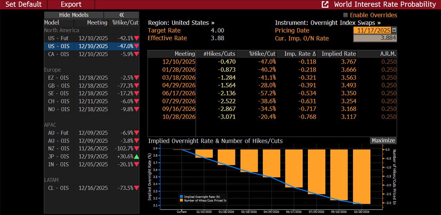 The coordinated tone reinforced Powell’s last FOMC remarks that another cut this year is far from assured. Markets are now pricing roughly a coin-flip chance of a move in December, a significant shift from the consensus just two weeks ago.