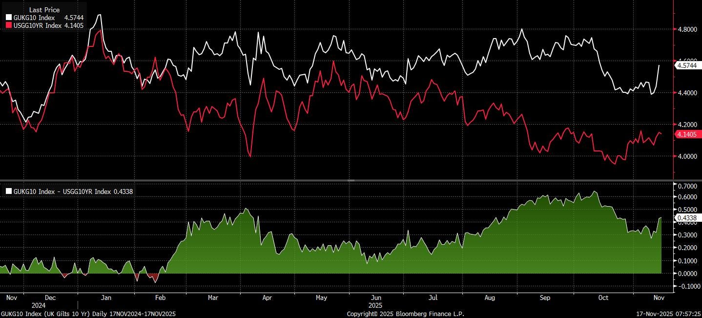 In FX and FI, the dollar mirrored equity volatility, finishing marginally weaker after several sharp intraday swings. GBP/USD led directional moves amid renewed UK fiscal worries, while USD/JPY repeatedly tested 155.00 but failed to break decisively. With delayed US data set to return, positioning in major pairs is likely to remain cautious into December’s FOMC meeting.