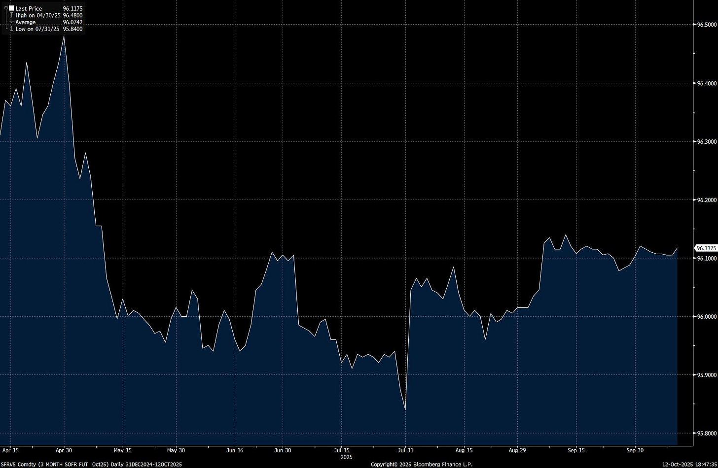 At 96.11, the October SOFR contract has a full 25bp cut locked in—a confident read for a market flying blind through a government shutdown and missing data. The Fed may have turned dovish, but cutting again so soon after restarting the easing cycle feels premature.