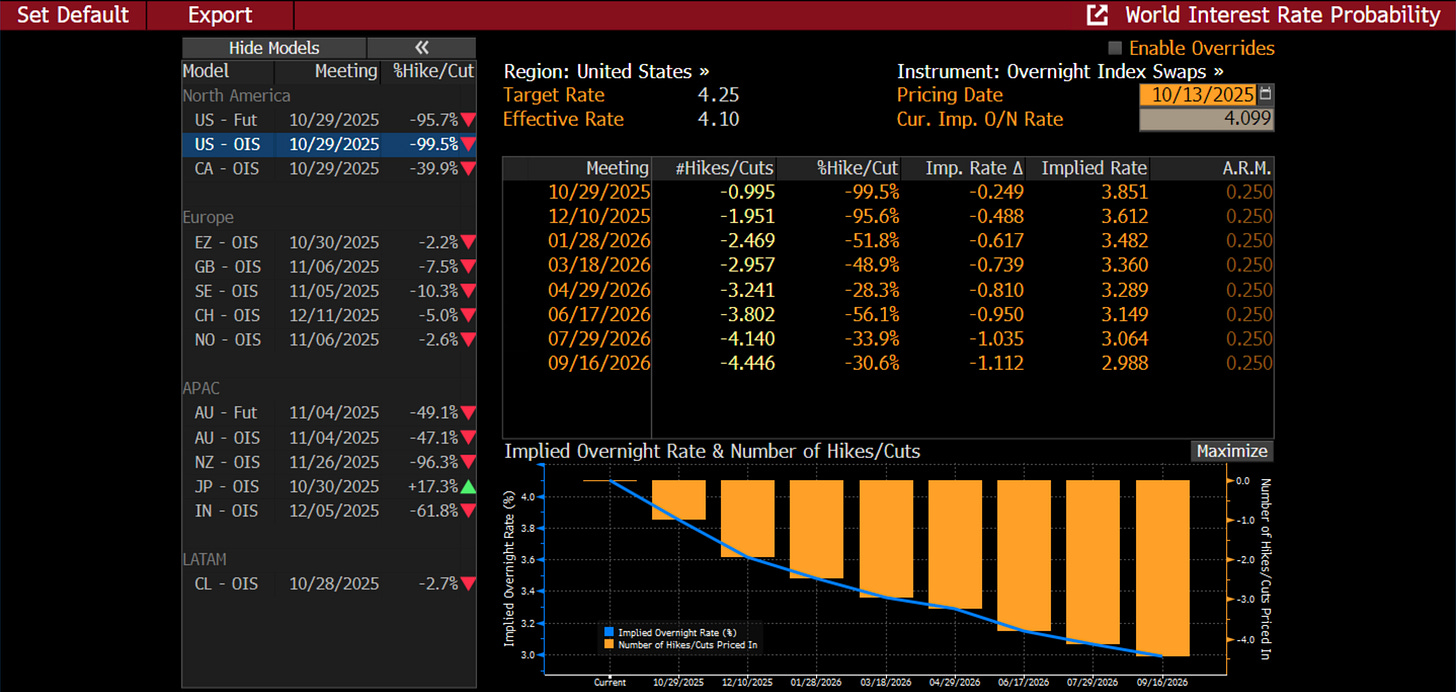 OIS pricing was little changed by week’s end, with roughly 25bps of cuts priced for October and 49bps in total by December, levels that continue to underpin the bull case for equities. The minutes also highlighted the Fed’s growing discomfort with the political noise surrounding its decisions, a tension likely to resurface in Powell’s remarks this week.