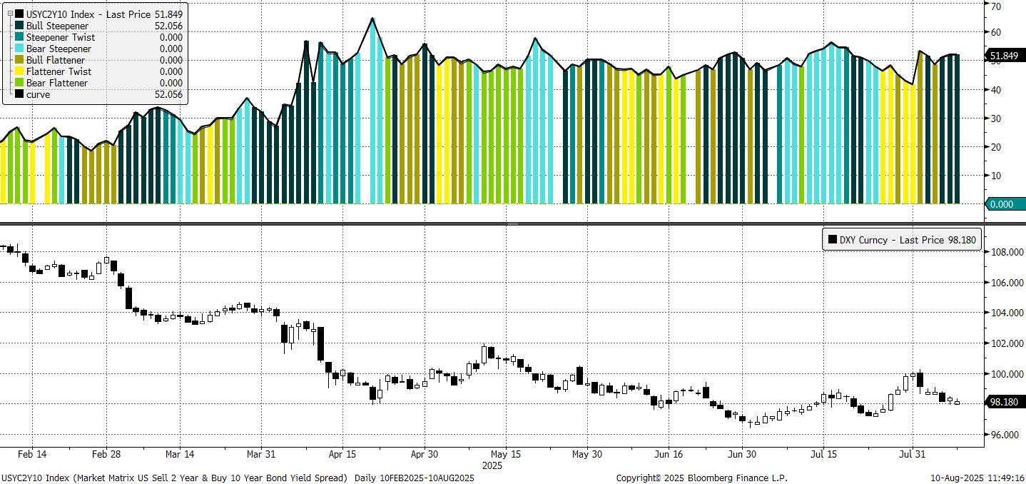 Economic data offered a soft note. July ISM Services missed expectations at 50.1 versus 51.5, with prices paid hitting the highest level since October 2022 and both new orders and employment declining. The report briefly knocked equities to session lows and underscored risks heading into a heavier data slate next week. Fed commentary was light, but speculation grew over potential changes to the FOMC’s composition, with Governor Waller (a known dove) seen as a frontrunner to replace Powell. Trump also nominated CEA Chairman Stephen Miran as a Fed governor, a move analysts say could steepen the curve.