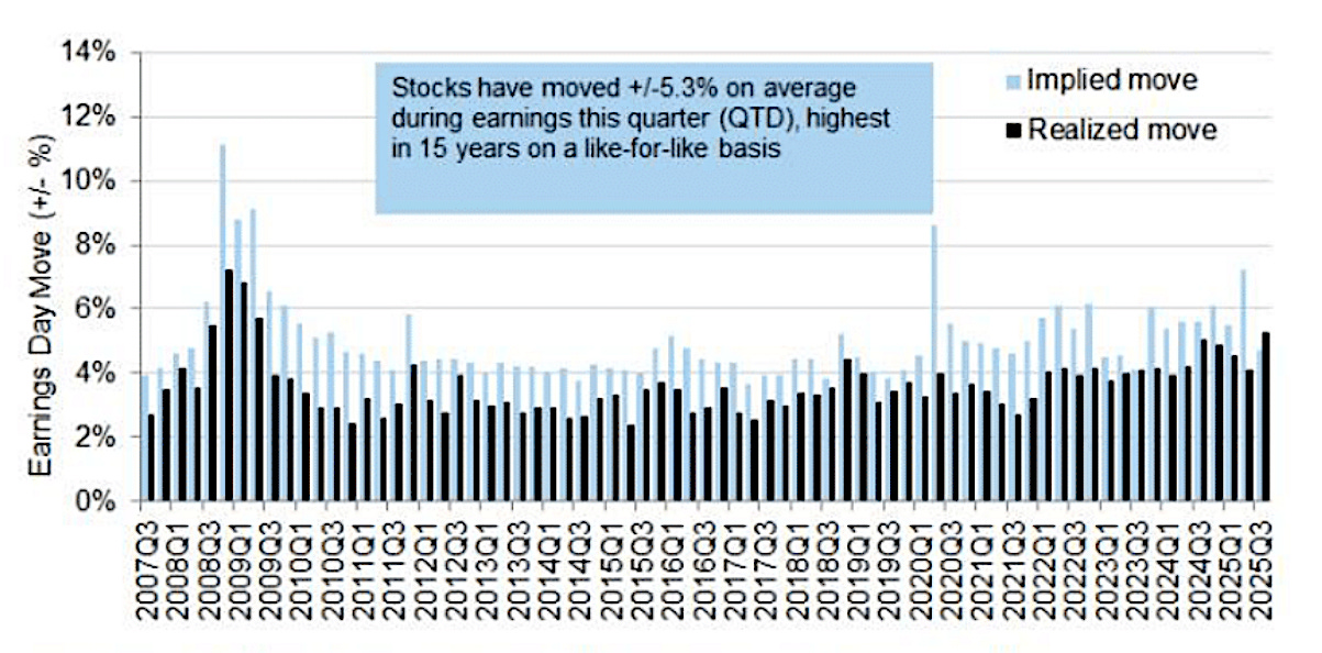 Earnings season is drawing to a close, but Goldman Sachs noted that the average post-earnings move for S&P 500 constituents exceeded options-implied expectations for the first time in at least 18 years—a rare sign of upside surprise outpacing market pricing.