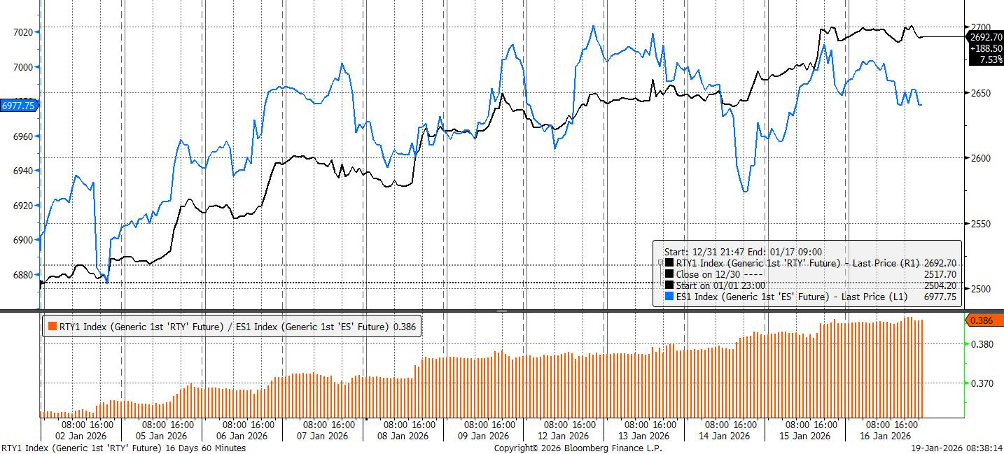 Tech remained unsettled. Megacaps are struggling to regain leadership even as select pockets of the semiconductor complex show signs of life. Sandisk’s (SNDK US) strength highlighted a rotation within tech rather than a revival of broad enthusiasm, reinforcing the sense that markets are becoming more selective. That same logic has helped fuel sustained outperformance in mid- and small-caps, with the Russell 2000 extending its relative run as concentration risk in megacaps becomes harder to ignore.