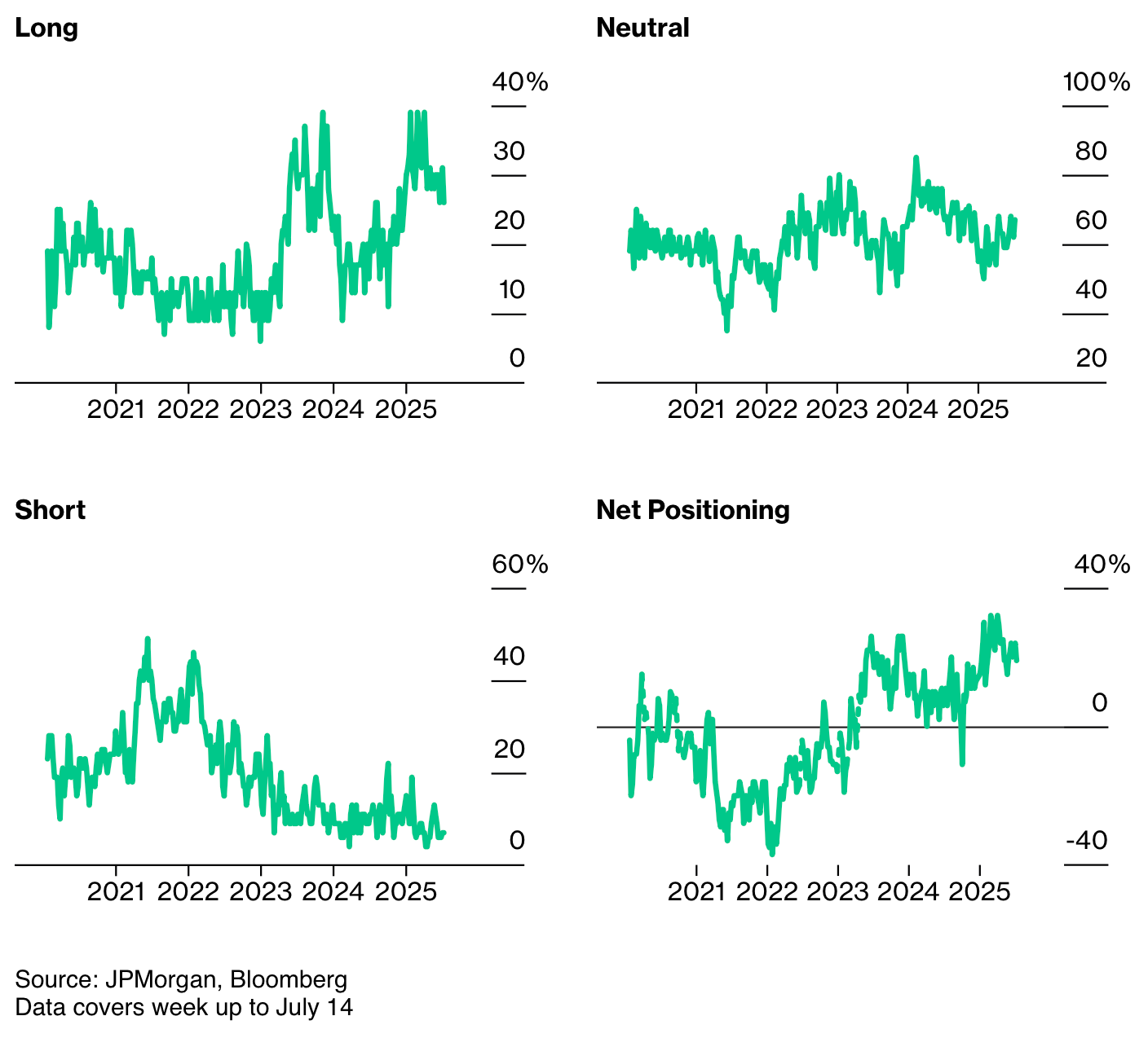 JPMorgan’s latest Treasury client survey shows net long positions fell to the lowest level since early June, down five percentage points to a neutral stance. That marks a clear retreat from prior bullishness and coincides with a jump in outright option hedging activity.