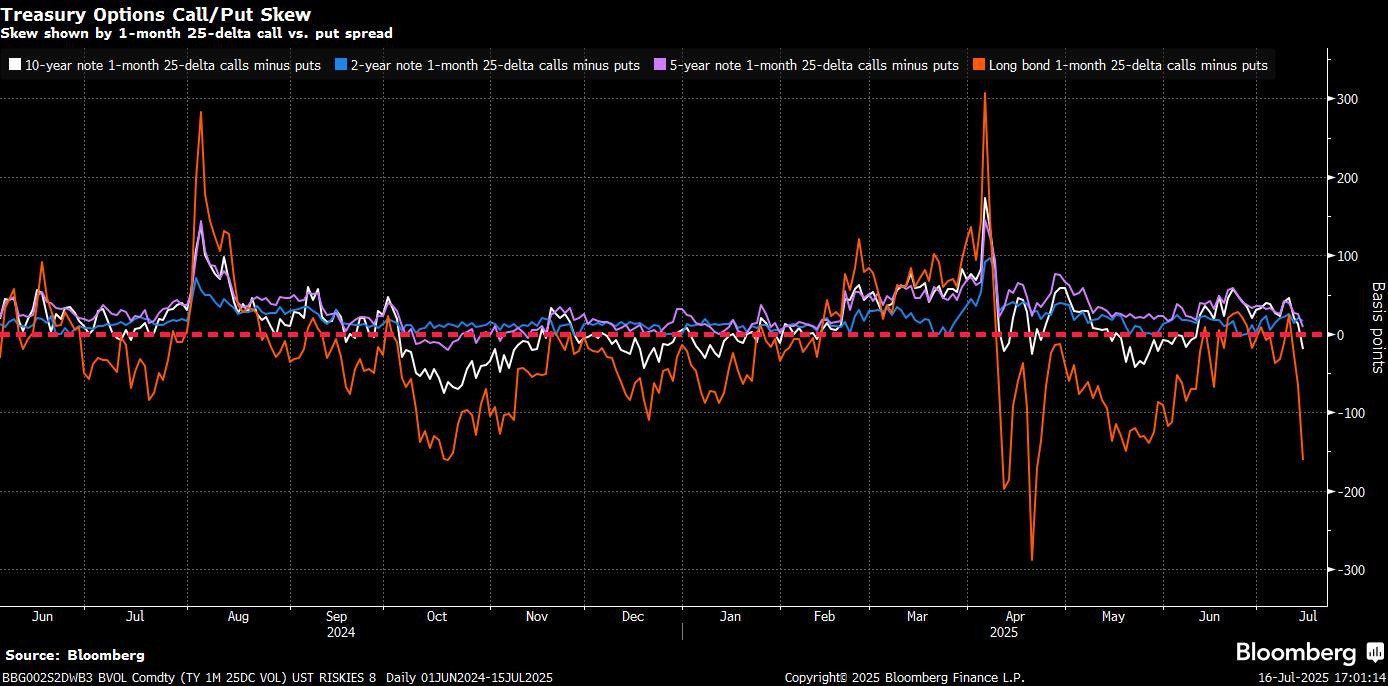 The skew in 30-year Treasury options flipped sharply in favour of puts, showing the highest demand to hedge downside in over a month.